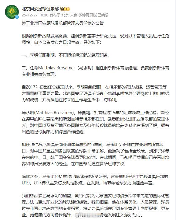 北京国安官宣李明离任 官方宣布,德国籍总经理马永明上任,负责俱乐部体育专业相关事务管理。李明任职到期,不再担任俱乐部总经理职务。马永明出任北京国安总经理