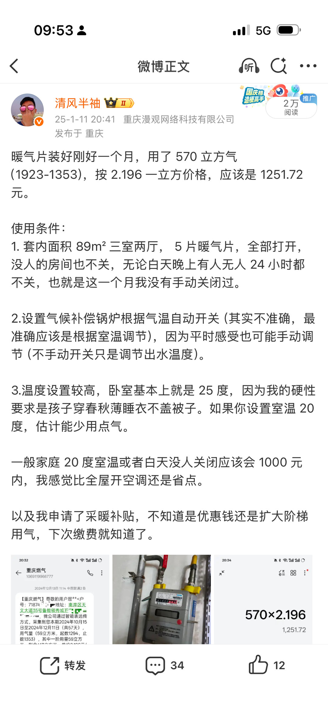 去年 12 月装的暖气片,当时开到 1 月用了570 立方,那个月交了 1600 多块钱,差不多全开三个月平均每个月花了 1000 燃气费。今年开得早 11 月底就开了,用了 295 立方,这次只缴了 647 块钱,再观察两个月看看,感觉今年会少花不少。一方面这个月还没那么冷,可能点火没那么频繁。另一方面今年设置的出水温度比去年低一点(去年娃穿着最薄的睡衣睡觉不盖被子,今年穿夏天的睡袋不盖被子)。总的来说,温度稍微设置低一点就感觉费用也还好。