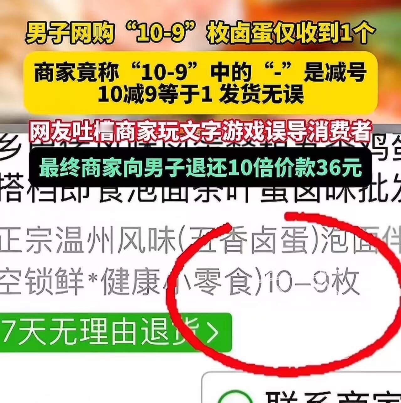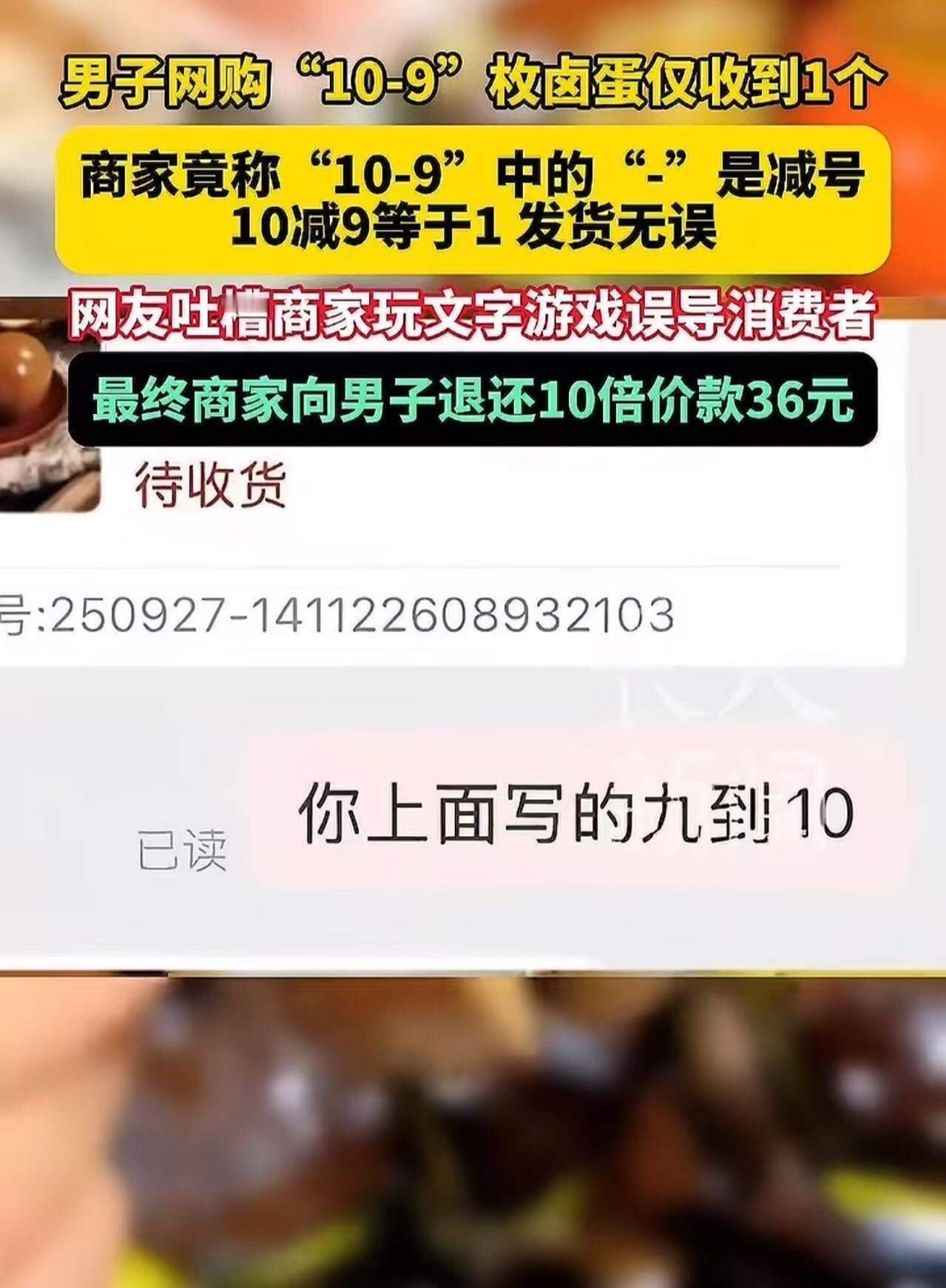 “搁这玩文字游戏呢?”河南,男子网购“10-9”枚卤蛋仅收到1个,询问商家怎么漏发,商家竟然称“10-9”中的“-”是减号,10减9等于1发货无误!男子气坏了,把这事情发到网上,让网友评评理!网友:得亏是10—9,要是9—10,你还得给它发一枚。 这事看似小打小闹,却折射出我们这个时代的“文字迷局”和“沟通断层”。你有没有想过,这个“10-9”的笑话,实际上暗藏着什么深层次的社会现象?它不只是一个网购的小插曲,而是一个关于理解、信任和沟通的缩影。 在这个信息爆炸、节奏飞快的时代,我们习惯了用简洁明了的数字来表达,甚至用符号、代码来沟通。可是,当这份“简洁”变成了误解的源头,问题就来了。男子以为自己买了十个卤蛋,却只收到一个,心里那点火气也就燃起来了。结果,商家一句“10-9中的‘-’是减号”让人哭笑不得。你说,这是不是一种“信息的断层”? 更令人深思的是,这个事件折射出我们对“沟通的艺术”已经逐渐丧失的现象。在日常生活中,我们是不是也像这位男子一样,面对那些没有用心去理解对方意图的“符号”时,陷入误解的泥潭?我们是不是也在不经意间,把简单的问题复杂化,甚至变成一场“文字游戏”? 其实,事情的核心,不在于“是不是漏发卤蛋”,而在于“我们是否真正用心去理解对方的表达”。在这个快节奏的社会里,人与人之间的信任比任何时候都更加脆弱。一句话、一条信息背后,可能隐藏着无限的误会和偏差。我们需要的,不只是“用字用语”的精准,更是一份“理解和包容”。 这个事件也提醒我们,生活中无论遇到多荒诞的事情,都不要轻易去笑话。因为它们背后都藏着人性的温度。我们要学会换位思考,用心去看待每一个“符号”背后的意义。毕竟,沟通是一门艺术,而理解,则是这门艺术的最高境界。 所以,下次遇到类似的“文字迷局”,不妨多一份耐心和善意。也许,一个简单的“你是不是误会了我”或“让我帮你解释一下”就能化解一场误会,拉近彼此的距离。毕竟,生活本就是一场需要用心去感受的旅程。别让“文字游戏”成为我们之间的“沟通障碍”,用真诚去打破每一层“误会的迷雾”。 这,就是我们每个人都应该思考的课题:在这个信息碎片化的时代,真正的沟通,靠的不是符号,而是心与心的连接。让我们用更多的理解和耐心,去迎接每一次可能的误会,让生活变得更加温暖而有意义。卤蛋一号 玩小卤蛋 无穷卤蛋