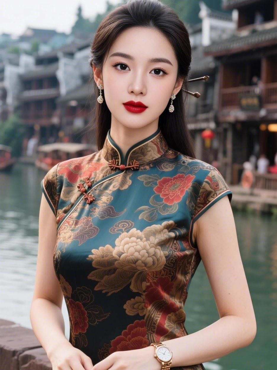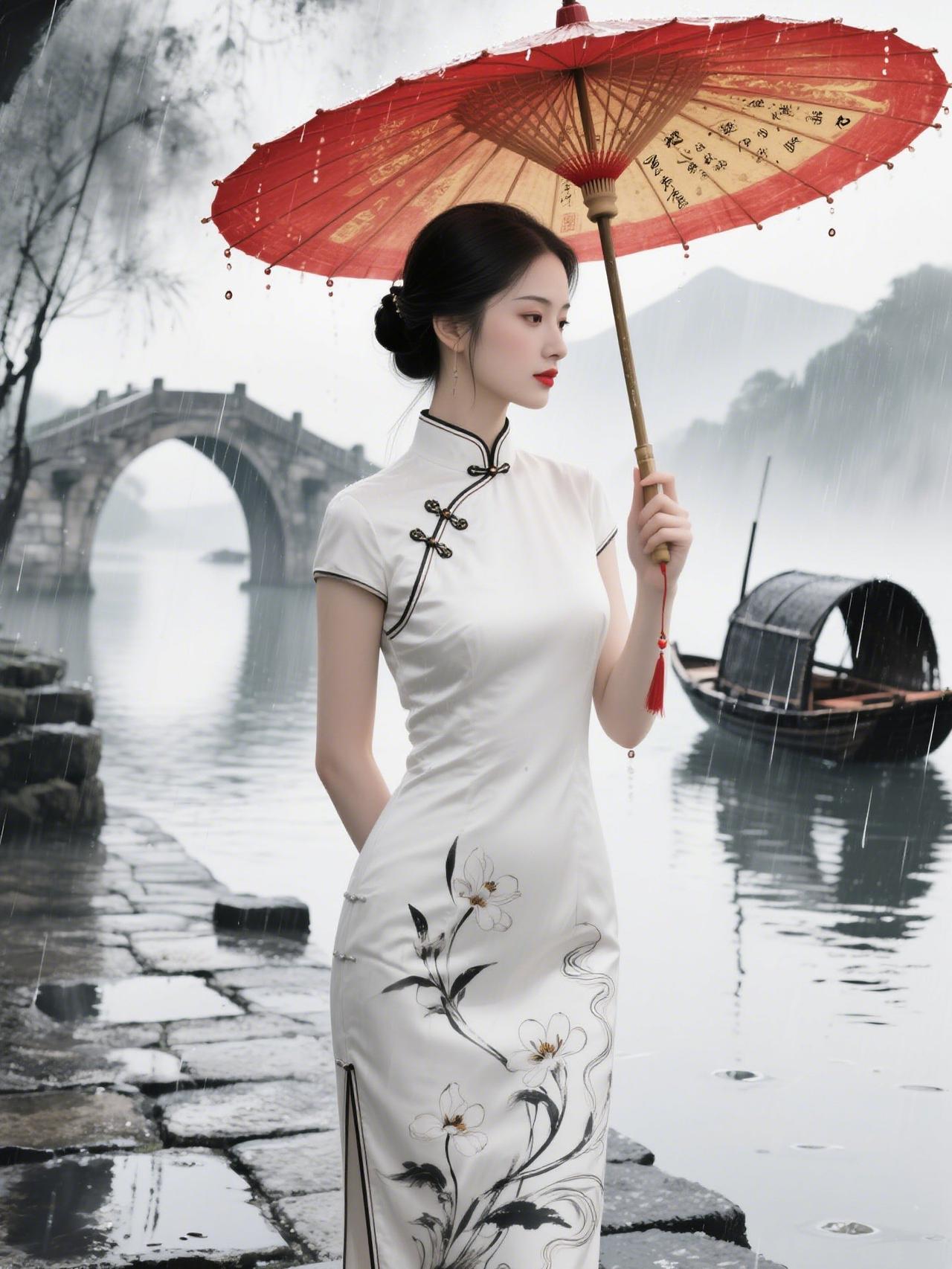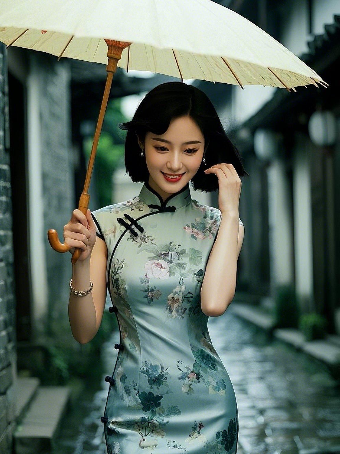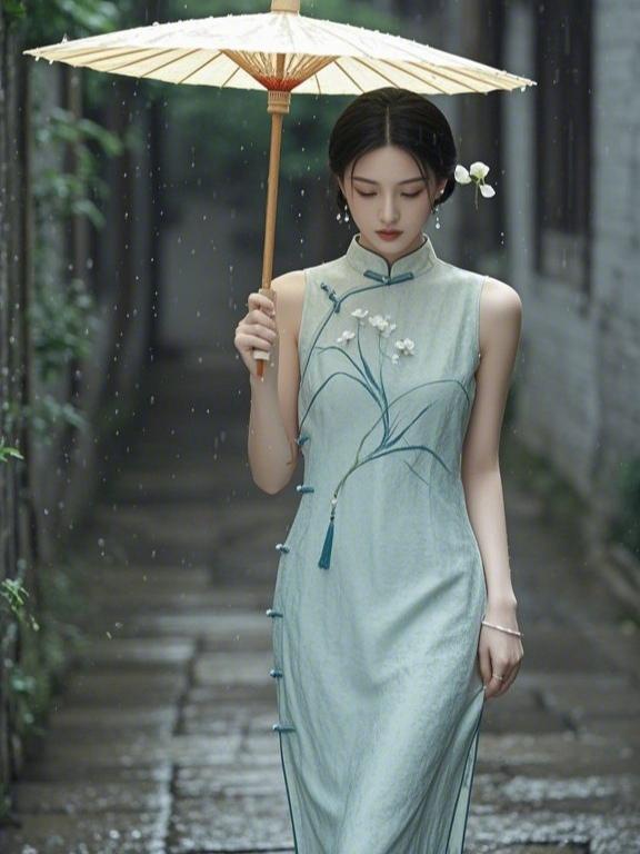 《穿旗袍的女子走过雨巷》 雨丝斜斜,织一袭透明的网 青石板润透了,浮着淡淡的光 油纸伞撑开半阙江南的韵 穿旗袍的女子,走过雨巷 素色的襟上,绣一枝含苞的玉兰 盘扣轻合,锁住了流年的软 高跟鞋叩击石板,清脆,又缓慢 惊起了,墙根下几丛湿绿的苔藓 她的发梢,沾着微凉的雨珠 眸子里盛着一汪,未言的雾 路过斑驳的木门,路过褪色的窗 路过时光,遗落的,细碎的怅惘 雨还在下,巷口的风轻轻荡 她的背影,洇进了水墨的远方 像一首短诗,没有落款 只留一抹,暗香,在雨巷悠长 旗袍风景 旗袍巷景照 江南旗袍伞照 旗袍雨巷 旗袍雨景 江南雨巷写真 雨巷红裙照