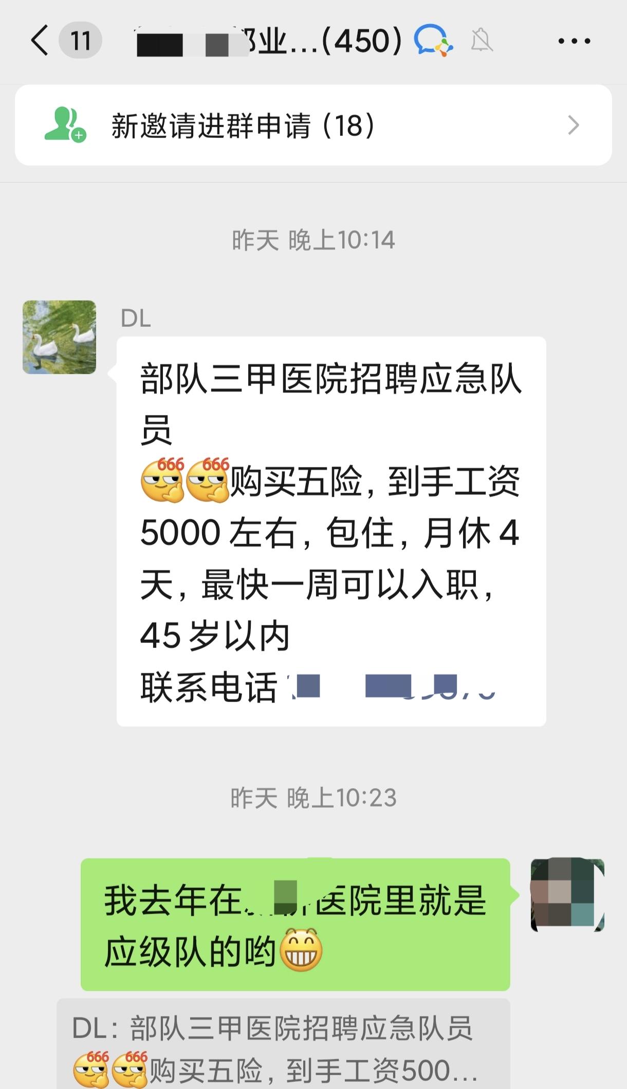 在重庆,部队三甲医院招聘45岁以下的应急队员(实际就是保安),5000块钱一个月,还包住包买五险一金,每个月按时发工资,你说你去不去?相信大多数45岁以下人一定都觉得不错吧? 我其实去年就在此医院里,干了两个月的应急队员,穿迷彩服、对讲机,还是有点神气活现的样子,不过,里面的有权有势官人太多太多,说是应急队员,实际上就是一个卑微的保安而已。 但是,今年换了一家物业公司,招聘岁数卡在了45岁以下,应急队员工资也确实提到了5000元,因此,看到小区业主群里有人发招聘信息,就去多说了几句,结果,对方就私下来加了我,聊天中,她说她以前在里面上班,现在在咱们搞招聘方面的,有很多强大的关系网,可以安排入系统上班,自然,医院招聘应急队员这简直就是小菜! 咱以前一直都是建筑行业搬砖的,别的不说,人力资源还真的是非常丰富,听她说得那么强大,又是一个小区邻居,于是,就老老实实给她介绍了很多里面相关工作的一些事情。 并且,也非常乐意为她提供人力资源,结果,有两个年轻小伙子听到提交答应去,可当我给她说了后,却突然冒出来“一个人要交2.5万服务费”,简单说,就是介绍费。 我一下子心情就凉了,你一开始说要给两万多的介绍费,老子才不会傻乎乎的去给人说也,想想,做个保安,多少年轻人会干一辈子呢?先交2.50万,直接就去了人家5个月工资了,傻瓜去呀? 哎呀,现在真的是处处都是坑,只分大坑和小坑了!实在想不到,现在一些人的心,黑得喉咙里伸出手啊!