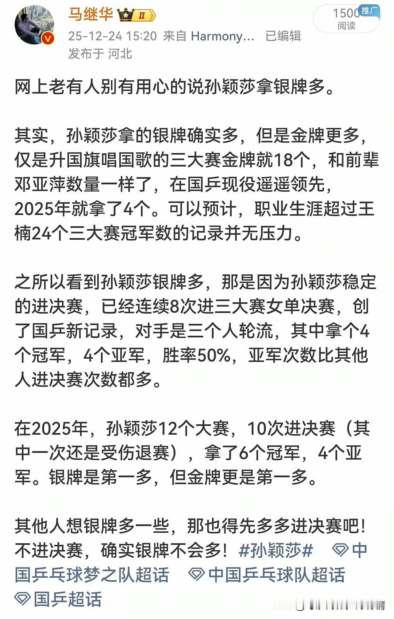 孙颖莎登热搜,实力与品格铸就乒坛传奇 孙颖莎再一次登上热搜,她用实力打破“不突出个人”的论调! 莎莎的成就从来不是偶然,而是球馆里日复一日的苦练,是赛场中咬牙搏杀的坚持,是她一拍一拍打出了属于自己的天地。 2025年她斩获18个三大赛金牌,连续8次进三大赛女单决赛,外战更是保持全胜。 这份为国而战的赤诚,胜败皆坦荡的气度,让她深深走进球迷心里,把国家责任焊在信仰里的孙颖莎,怎能让人不爱?