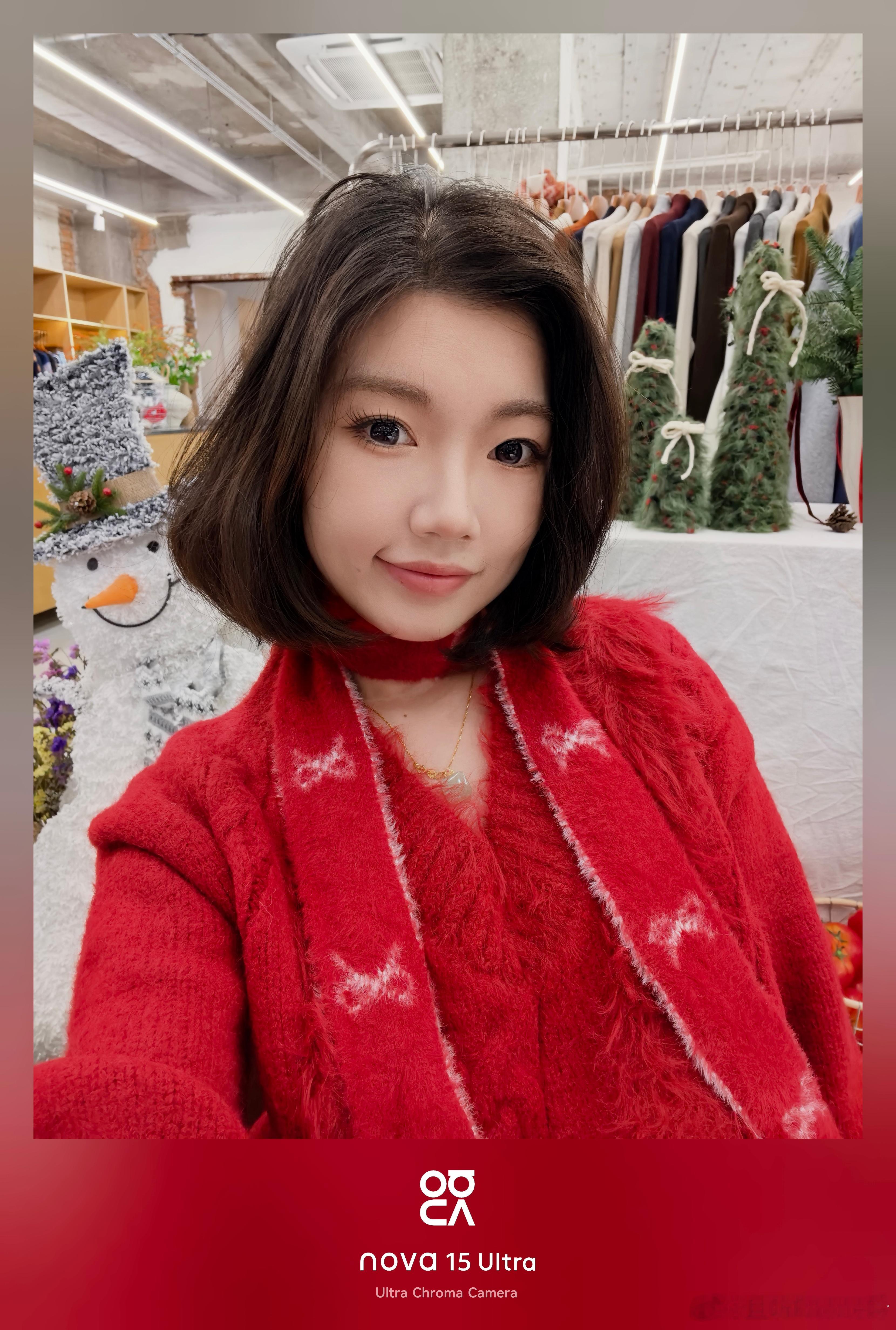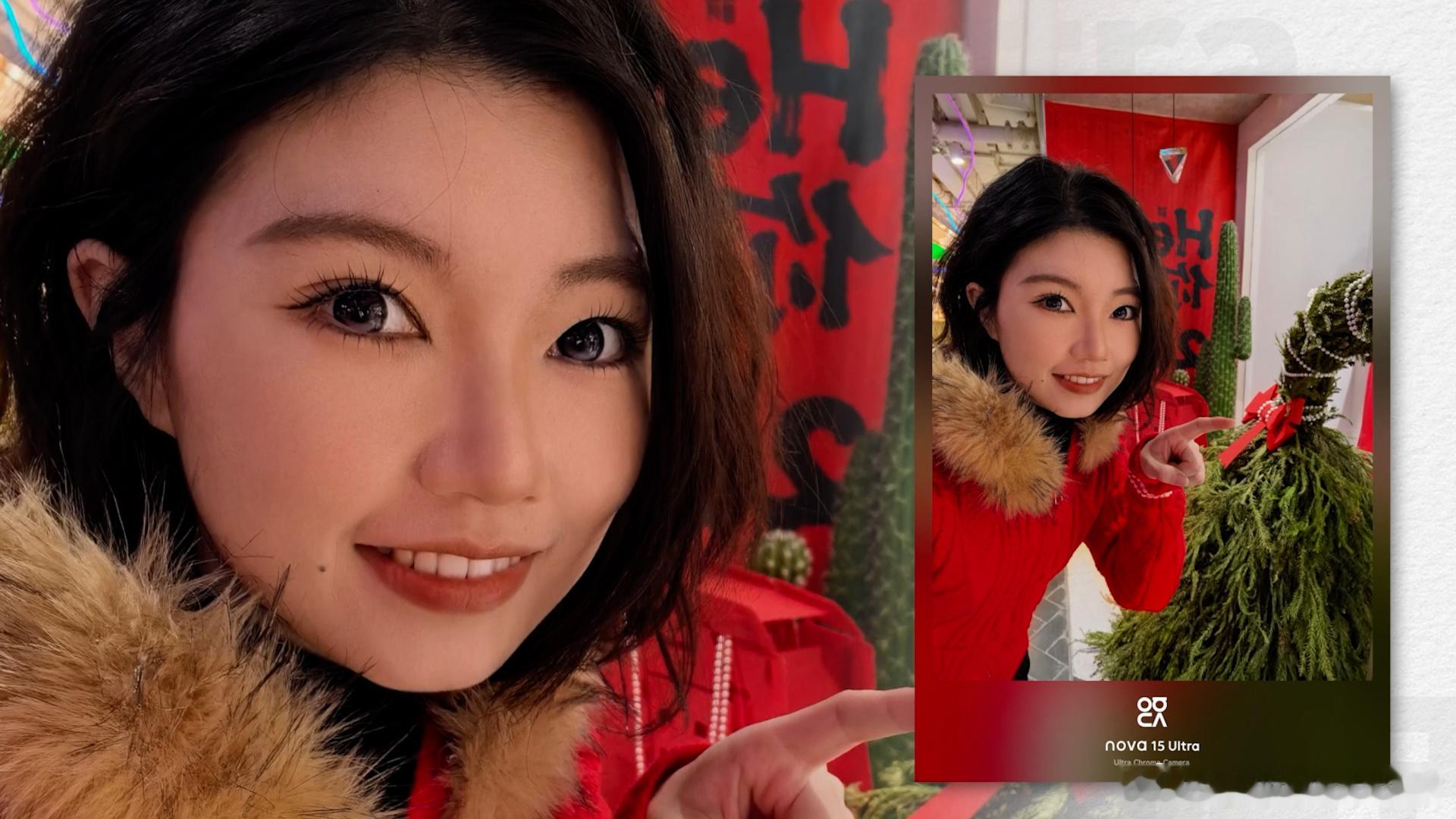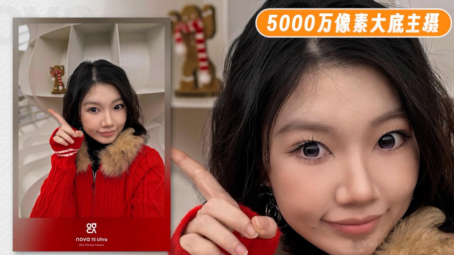 自拍一直nova的主场,13Pro的6000万前置,14U的2X/5X双5000万前置,到了15U依然是双摄。不过15U这次并不是传统的两颗镜头,而是5000万主摄+红枫,画质和色彩还原都有了。看样张(图1/2),妆面的还原很到位,眼部美瞳、鼻影,都是非常灵动、立体的效果。同时也没有过多的计算显得妆面不干净。而且前置最高支持5倍变焦(图5/6),5000万像素的优势就出来了,虽然并不是光学焦段,但清晰度确实不错,明亮暗光都很好看。