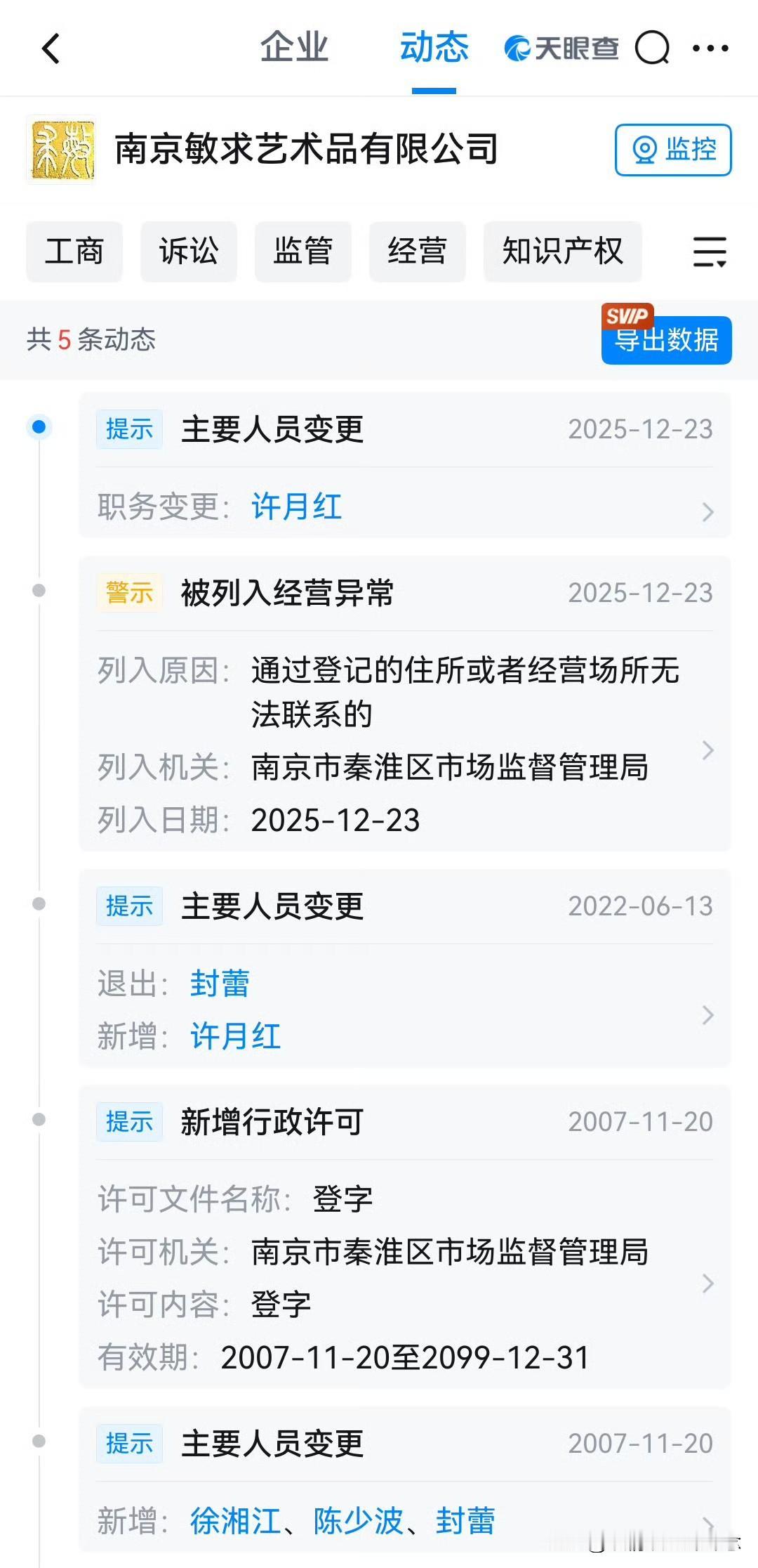 这也太巧合了吧, 徐湖平才开始被调查, 他儿子徐湘江的公司就经营异常了。 今天,《亚洲周刊》又发动态,徐湖平儿子徐湘江的公司被列入经营异常。 通过天眼查可以看到,徐湘江的南京敏求艺术品公司2007年成立,徐湘江持股60%。 2025年12月23日中午,徐湖平被调查组带走,也就是同一天,徐湘江的公司被列入经营异常,原因是通过登记的住所或者经营场所无法联系的。 大家说,这是不是调查组动作太快,连带着把关键的线索都锁定了?还是说徐家那边一察觉到情况不对,就急着转移? 一家开了将近二十年的公司,本来就顶着艺术品的名头,可能还跟徐湖平的收藏圈人脉有千丝万缕的关系,现在赶上这节骨眼出这事儿,更是说不清道不明。 目前看,这可能只是第一步。公司异常只是工商信息层面的变动,后续会不会牵扯出其他更严重的违法操作,还得看调查的深入程度。 现在整件事充满了一种“山雨欲来”的气氛。等等看吧,估计后面还有更多消息冒出来。 徐湖平 徐湘江 【免责声明】文章描述内容、图片均来源于网络,此文章在倡导社会正能量,无低俗等不良引导,如涉及版权或者人物侵权问题,请及时联系我,我会第一时间删除。