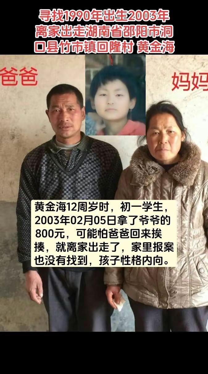宝贝回家编号:167875姓 名:黄金海性 别:男出生日期:1990年06月02日(阴历)失踪时身高:150CM失踪日期:2003年02月05日(阴历)失踪人所在省:湖南省失踪地点:湖南省邵阳市洞口县竹市镇回隆村失踪者特征描述:头旋,断掌纹不详,圆脸,耳朵大,眼睛大,后背有个痣是否报案:是(湖南省洞口县竹篙塘派出所)是否采集DNA:否其他资料:1、失踪经过:黄金海12周岁,初中一级学生,2003年02月05日,当天拿了爷爷的800元,可能怕爸爸回来挨揍,就离家出走,家里报案了也没有找到,孩子性格比较内向。2、家庭成员:父亲:黄启淼,母亲:许池云,姐姐,爷爷是退休老师3、口音:湖南省洞口县当地口音dou来寻人 冬天不冷传递正能量 寻亲
