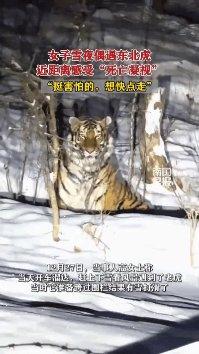 女司机雪夜遇虎,俩大眼瞪小眼看了5分钟。 车里人: “它会不会扑过来?” “这