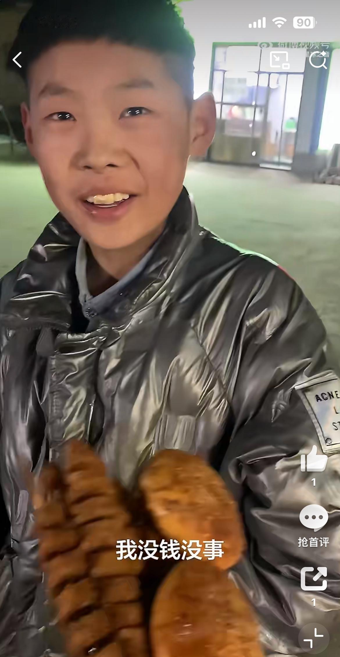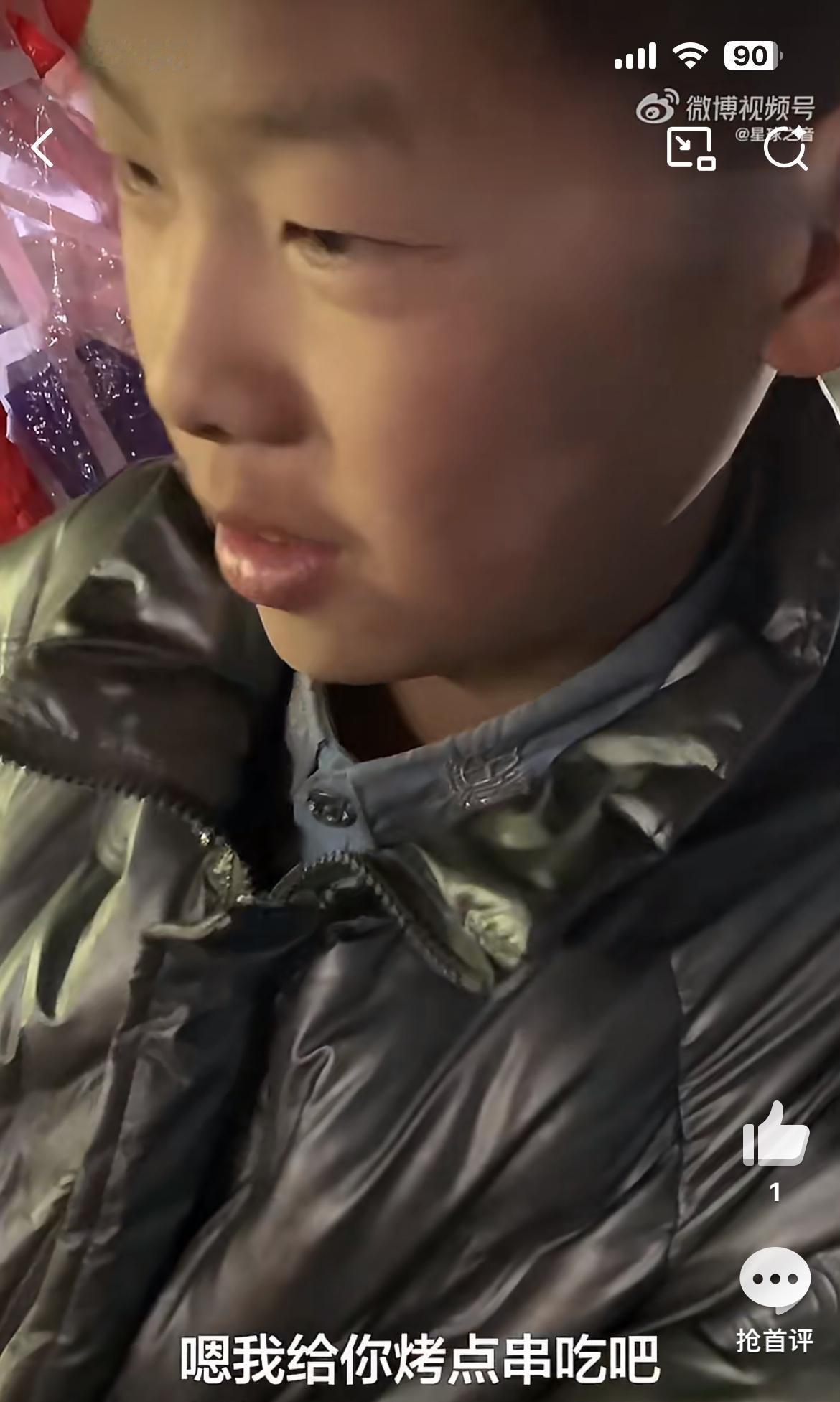 这个十岁的孩子饿了没饭吃,爸爸死了,妈妈跑了,烧烤老板看他可怜,送了烤串给他吃,吃完叫他别在外面晃了,赶紧回家。听小孩介绍,应该是叔叔在管他,但是叔叔不在家,就只能饿着,一饿就到街面上晃悠,这个烧烤老板不是第一次看到他了。听口音,像是山河四省一块的。儿子离家出走了