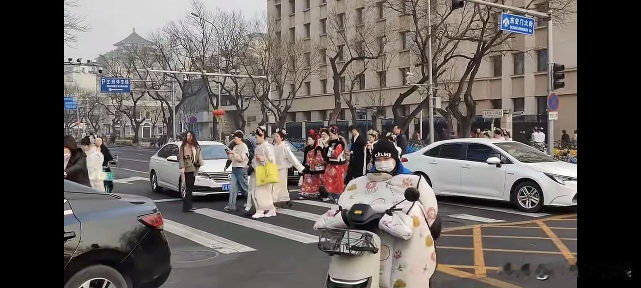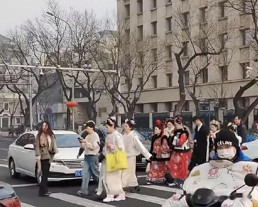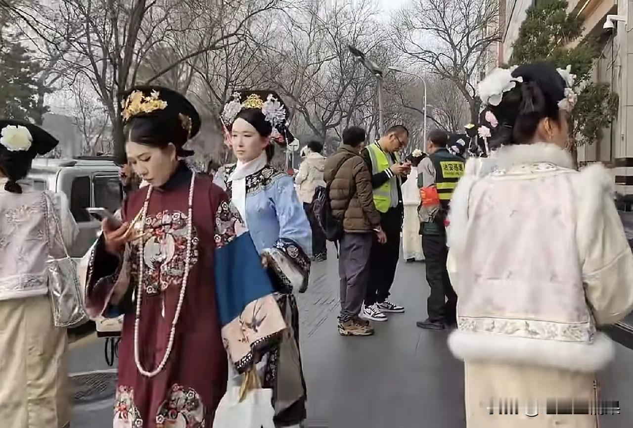 网友拍摄到北京大街上一大堆穿着清朝格格和皇上妃子服装的人,不知道她们是拍戏表演还是真的喜欢清朝的服装。 如果是表演需要穿的,似乎不需要那么多人吧,剧组再有钱也不会这么挥霍。 那就是喜欢这样的服装穿着,其实她们穿的这些衣服和清宫剧里面的衣服基本一致,因为都是效仿电视剧里面衣服制作的,用现代工艺和审美对清朝女子着装进行了从头到尾的美化。 看过真实清朝皇宫妃子们照片的人都知道,就那个穿着实在是一言难尽,中华民族丢不起那个人。 还有一个更重要的清朝女人都是要裹小脚的。 既然现在还有人喜欢穿清朝服装,强烈建议把她们的脚强行从裹小脚开始。