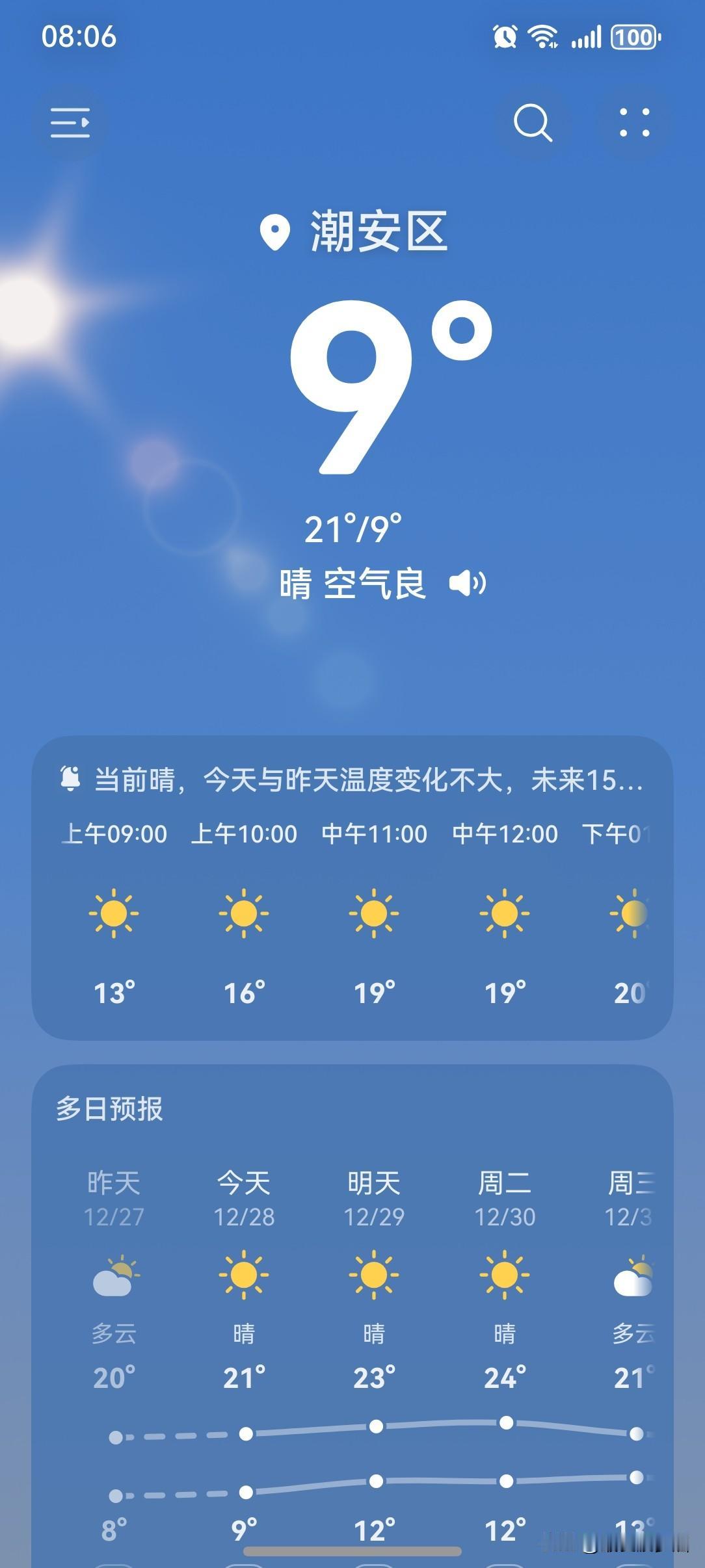 广东:晴朗干燥天气模式开启啦! 今天(28日),广东大部晴到多云为主,气温逐渐回升,但昼夜温差较大。白天暖洋洋,早晚凉飕飕的,洋葱式穿衣发get起来! 今天(28日),潮州再次喜提一个晴天,气温9~21℃,此刻气温9℃,体感温度7℃。 嘿嘿~别以为气温回升就暖暖的!早上还是蛮冷的,现在的气温只有9℃,体感仅剩7℃,比昨天早上还冷呢! 看看今天的天空!虽说是晴天,一大早就能看到太阳,但早上的气温依然是低迷的。不过,有阳光的加持,气温上升应该会比较快。 如非必要,冬天的周末早晨,还是不要那么早起床,毕竟早上除了冷还是冷! 虽然说冷空气减弱,气温回升,但早晚依然寒冷的,还是要注意根据温度变化增减衣物,别让白天的气温迷惑了,同时也别让流感病毒有机可乘! 今天的这样天气,依然值得一个好评,天气晴朗,但“五星”是不能够的,毕竟早晚那么冷,不太好。 如此天气!元芳,你怎么看? [捂脸][笑哭][捂脸][我想静静][笑哭][捂脸][捂脸][笑哭][捂脸]