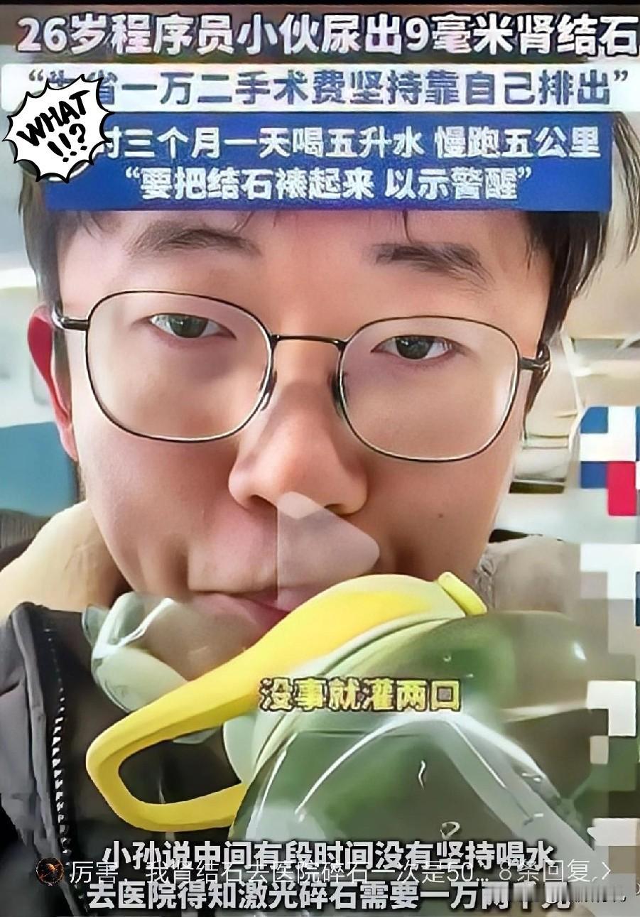 只有想不到 没有做不到的事 26岁的小伙子为省一万多手术费,听了医生的话,三个月每天喝5升水加坚持慢跑5公里,终于排出9毫米肾结石。 医生:8毫米以上自然排出仅20%概率! 因为肾结石导致了他左侧肾区疼痛难忍,医生为他做了CT检查,发现左侧肾结石直径9毫米,正好卡在输尿管入口处,导致左侧肾积水和尿路感染。要想治愈尿路感染,必须先把结石排出才能进行后续治疗。 三个月以来,他每天逼着自己喝5升水,逼着自己慢跑5公里,别人喝水就觉得饱了,他还逼着自己喝,不到5升绝不罢休;别人觉得累了跑步就停下,他还逼着自己坚持跑完5公里,不中途停下。 “我排出石头的时候,都觉得不可思议,这么大一个石头怎么会从尿道排出啊?惊吓之余也后怕,如果我放弃了,那我就无法把石头排出来,我的努力也就白费了。”他说。 大医精诚,医者人心;仁心仁术,人文关怀!