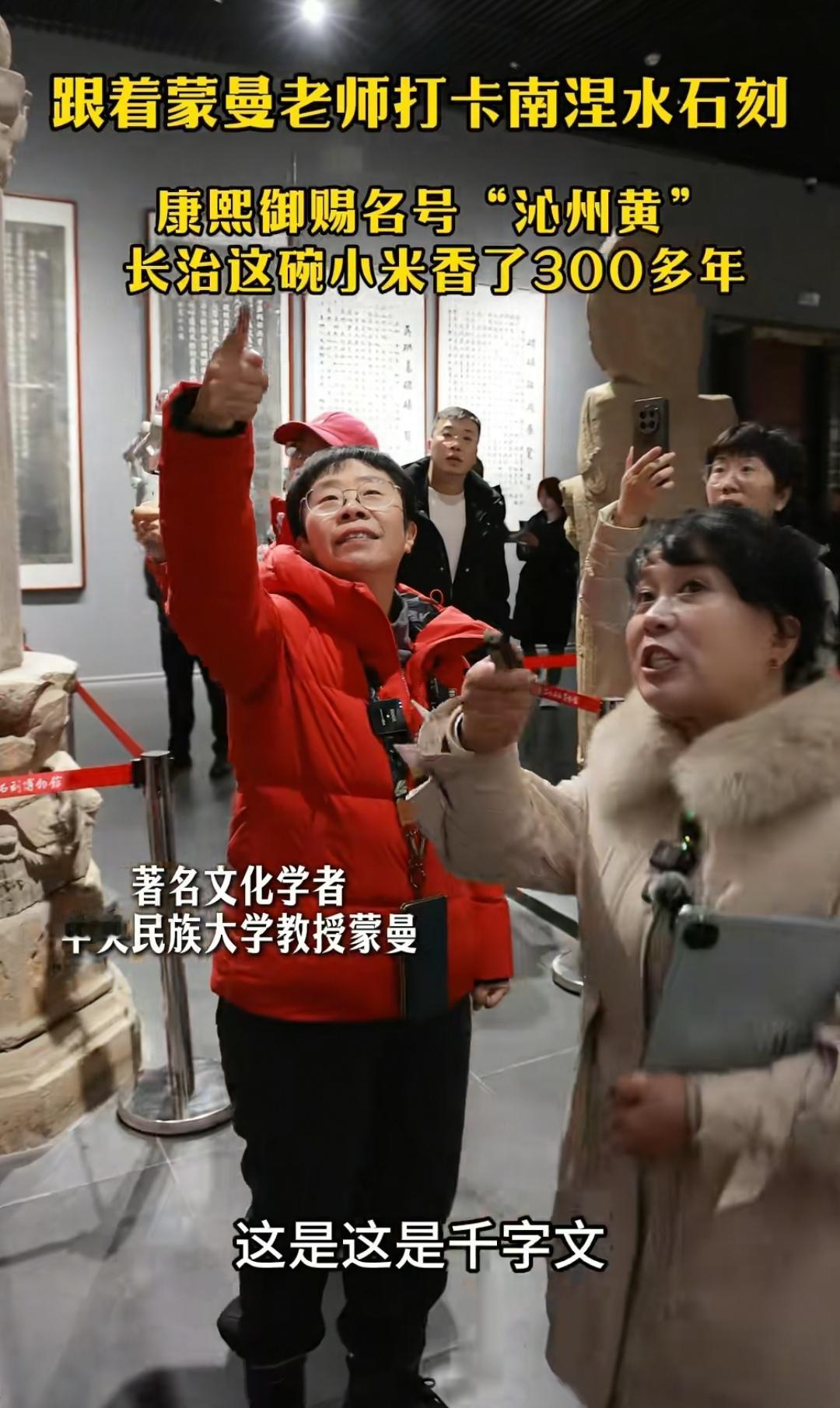 12月27日,蒙曼老师来到了山西长治,带领大家感受文旅文化,增强大家对山西文化的感受。 蒙曼老师这次来长治是冬季寒冷的时刻,穿着红色羽绒服,穿梭在各大文化景点,以直播的方式为大家呈现当地流传下来的文化。 蒙曼老师赶在元旦前,宣传山西文化,也是做出了自己的贡献。