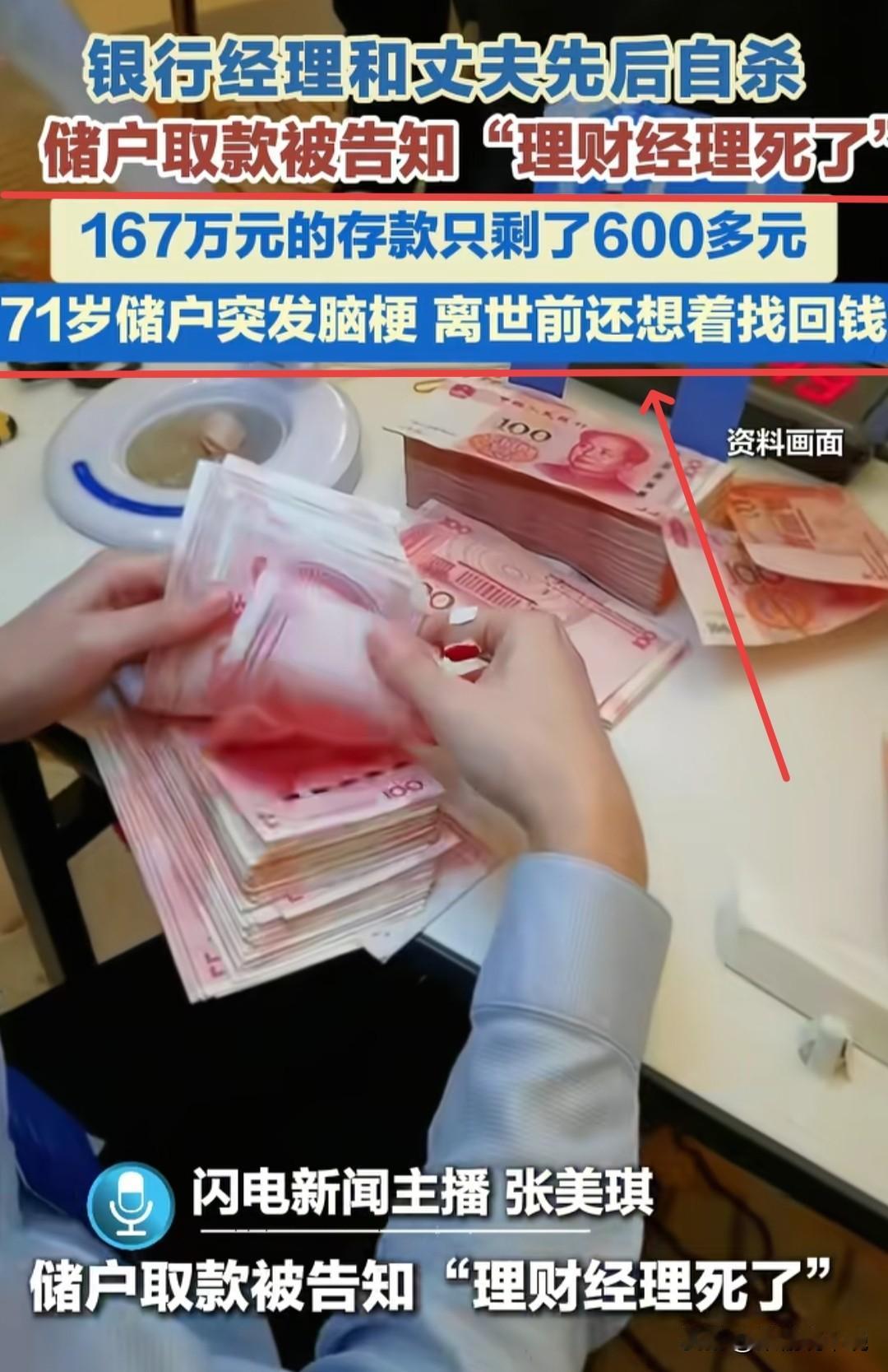 理财经理挪用储户存款的后遗症来了 七十多岁老人情绪激动突发脑梗死亡 老人存款有167万,离世前还想着要回自己的存款! 银行经理王某姗被发现在家中自缢身亡后,她服务的储户中有一对老人夫妇,二人去银行取钱的时候才发现自己辛苦一辈子攒下的167万竟然只剩下600多元了,71岁的老先生一下子接受不了这个情况当场瘫倒,随后突发脑梗不幸去世!老一辈人都很节俭,辛辛苦苦、省吃俭用一辈子,到头来全给别人做了嫁衣,这种情况别说老人了,年轻人也接受不了啊! 谁的钱都不是大风刮来的,大家存钱是冲着银行存的,不是冲着理财经理存的,银行经理也是为工作单位服务,银行必须监管到位,出了事情银行必须负责,不能说银行经理离职了或者去世了就不作为了!据不完全统计,王某姗挪用储户的存款就已经超过了3000多万!对此,大家怎么看呢?