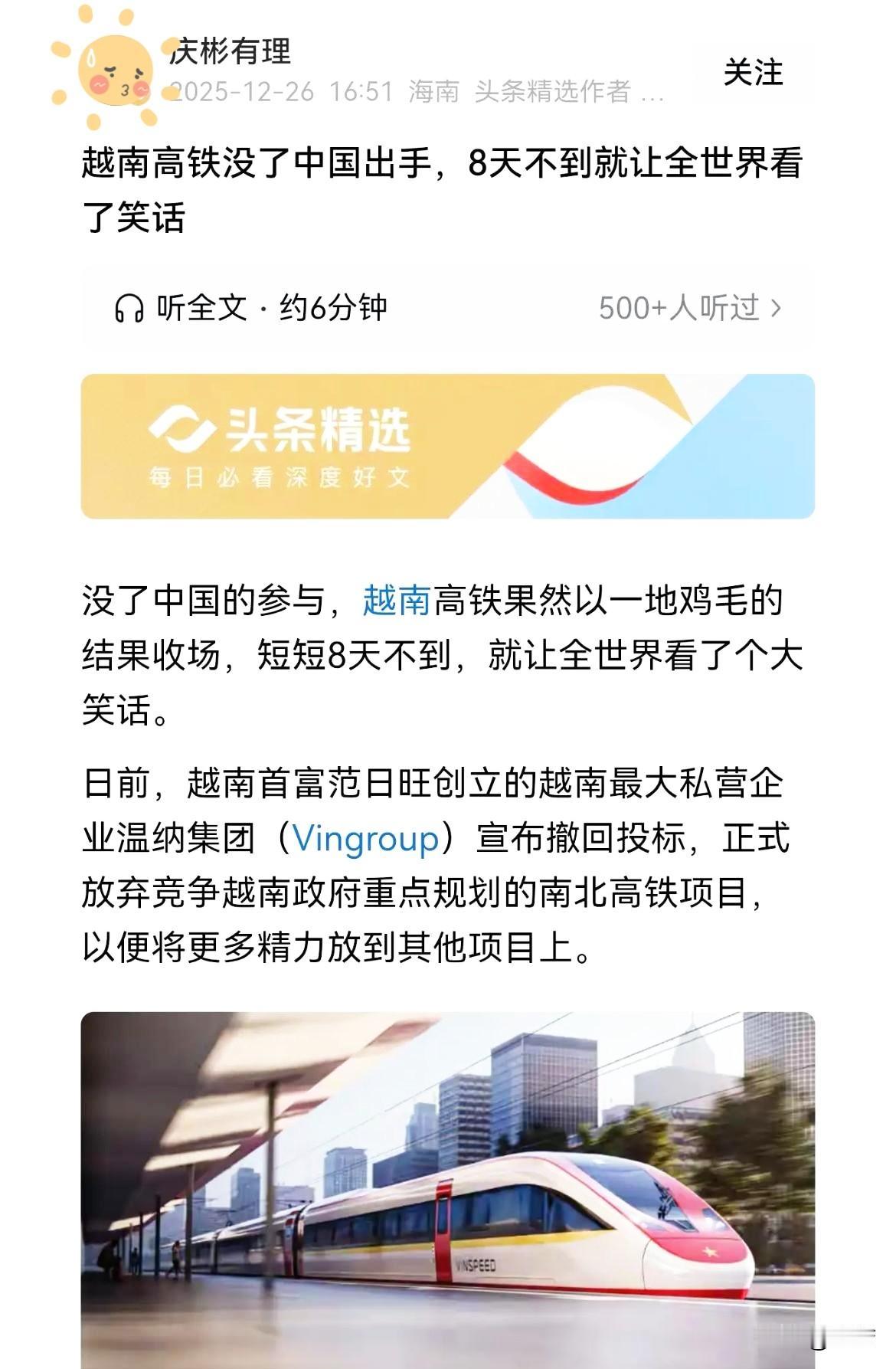 这事从一开始“中国就心如明镜” 越南做局请西门子当托 结果中国没去抢让托中标了骑虎难下 只能VANFAST宣布弃标 越南看中中国的高铁技术 以高铁建设项目为由做局 结果被中国一眼看穿 越南想通过高铁项目引东国投资技术 做大做强国企结果东国置之不理 越南尴尬收场只能让中标企业自行退出 越南的迷之自信 本质是没看清“红利期已过”的现实 以前大国抢着布局第三世界市场 让它错以为自己是香饽饽 却忘了自己连专业高铁技师都没几个 铁路还是百年前的米轨 居然敢让地产商 车企牵头修350时速高铁 想白嫖核心技术还不愿政府兜底 把风险全甩给合作方 这种“空手套白狼”的算盘中日早看透了 日本中标二十年没进展就是最好的证明中国不接招不是没实力而是不愿做亏本的“技术扶贫” 真正的合作得互利共赢 不是单方面索取 越南连基本的工业底子都没有 却总想靠玩“平衡术”占便宜最后只能是自食恶果