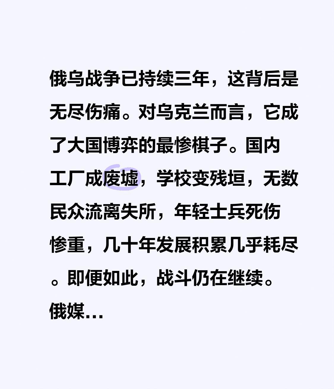 俄乌战争已持续三年,这背后是无尽伤痛。对乌克兰而言,它成了大国博弈的最惨棋子。国内工厂成废墟,学校变残垣,无数民众流离失所,年轻士兵死伤惨重,几十年发展积累几乎耗尽。 即便如此,战斗仍在继续。俄媒称俄军无人机炸死乌情报和安全官员,作为对俄方军官遇害的回应;而乌军也用导弹袭击俄炼油厂,该炼油厂是俄南部重要石油供应商。可西方援助并非无偿,都附带苛刻条件。乌克兰前路艰难,这场战争不知何时才能真正结束。