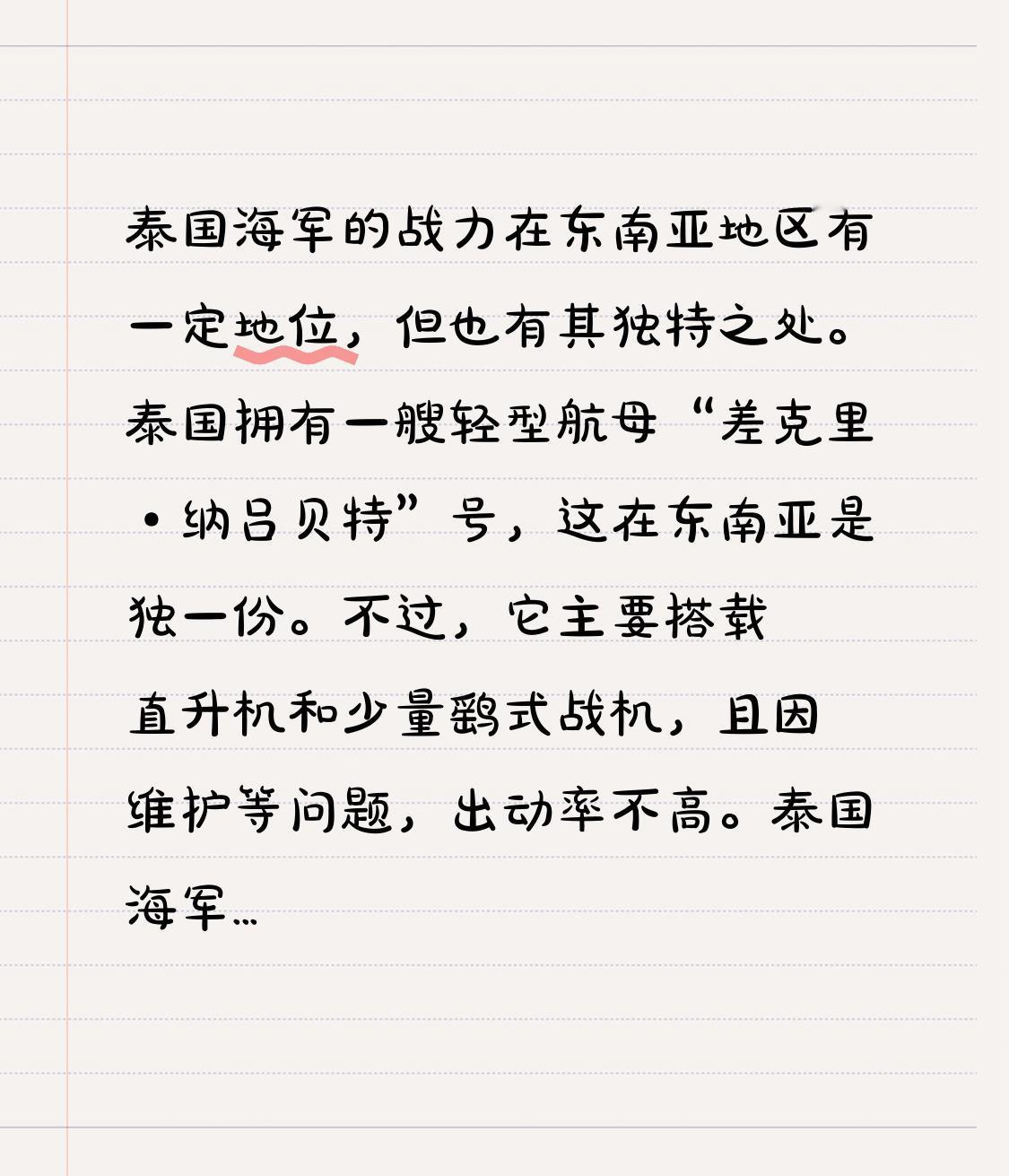 泰国海军的战力在东南亚地区有一定地位,但也有其独特之处。 泰国拥有一艘轻型航母“差克里·纳吕贝特”号,这在东南亚是独一份。不过,它主要搭载直升机和少量鹞式战机,且因维护等问题,出动率不高。 泰国海军还有护卫舰、巡逻舰等舰艇。护卫舰方面,从中国引进的053HT型护卫舰等发挥着重要作用,具备一定防空、反舰能力。巡逻舰则用于近海巡逻等任务。 但总体来说,泰国海军规模不算大,装备水平和作战能力受限于资金等因素。与世界强国海军相比有差距,不过在维护本国海洋权益和地区稳定方面有自己的价值。