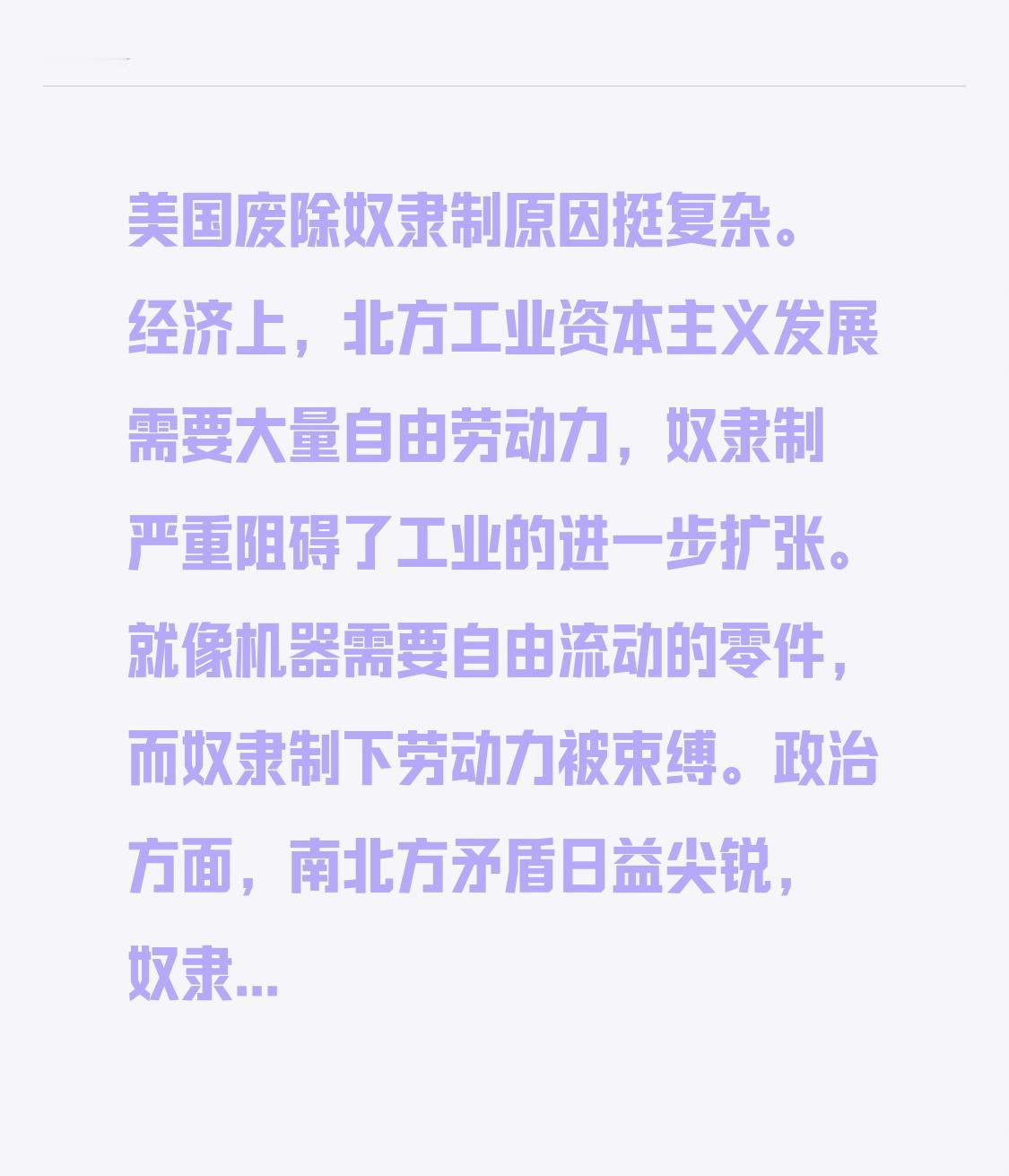 美国废除奴隶制原因挺复杂。经济上,北方工业资本主义发展需要大量自由劳动力,奴隶制严重阻碍了工业的进一步扩张。就像机器需要自由流动的零件,而奴隶制下劳动力被束缚。 政治方面,南北方矛盾日益尖锐,奴隶制成为南北冲突的焦点。南方种植园主依赖奴隶劳动,北方则反对这种落后制度,为了国家统一,废除奴隶制势在必行。 还有社会观念的进步,人道主义思想逐渐深入人心,越来越多人意识到奴隶制的不人道。林肯等政治家也推动了废奴进程,最终通过一系列法案,美国废除了奴隶制。