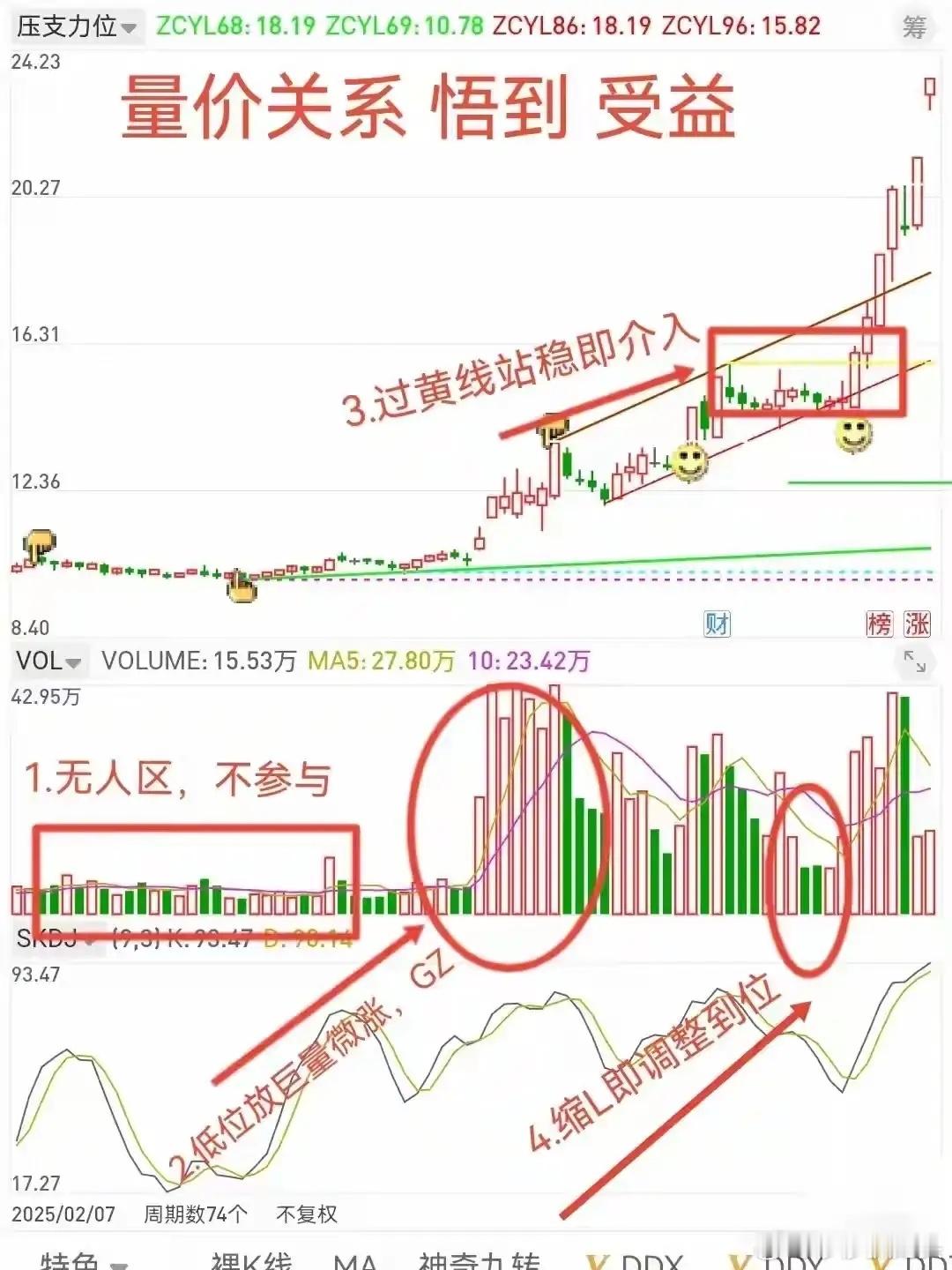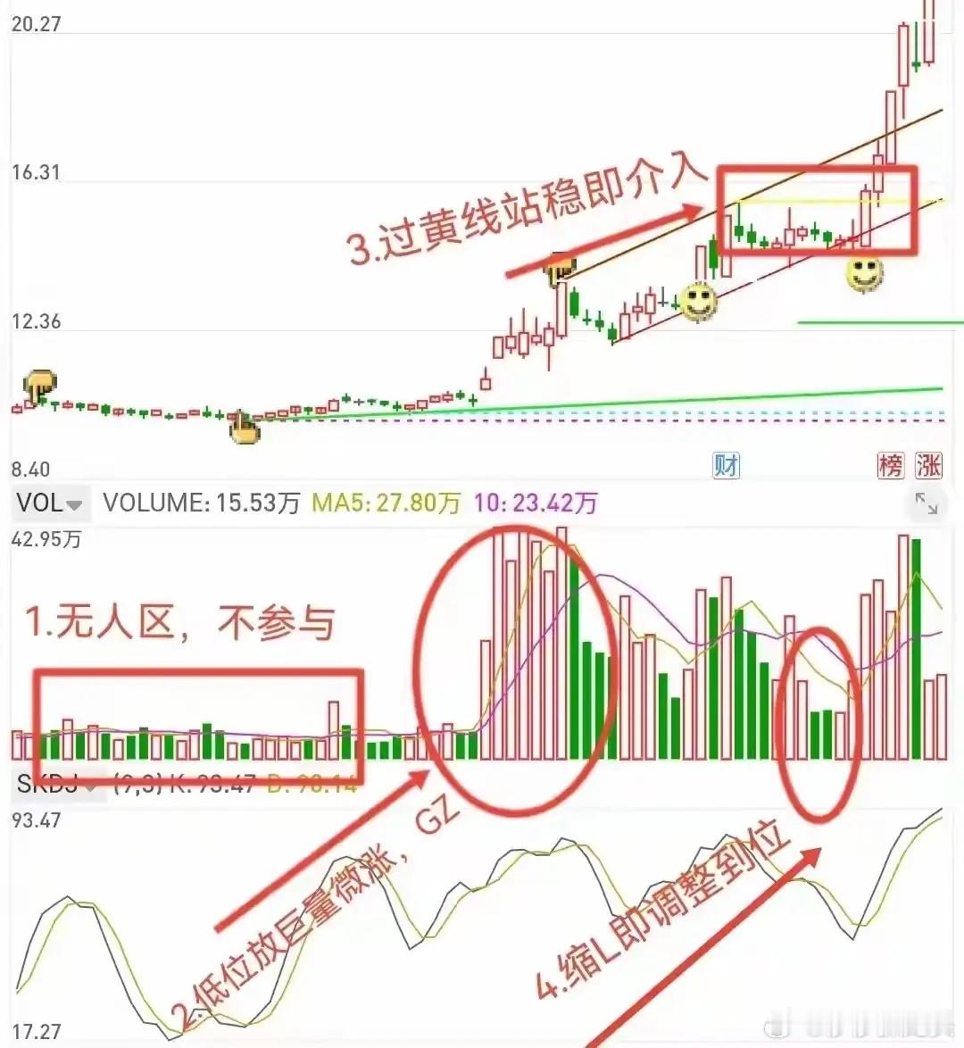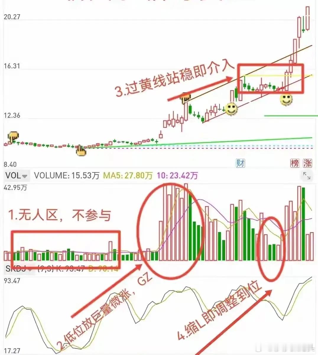 吃透量价关系的核心逻辑,找准入场点,散户也能抓准主升浪!一定要明白!在股市里,价格就像船,成交量就是水。水能载舟,亦能覆舟。想抓住气势如虹的主升浪行情,最关键的不是天天盯着价格上下跳动,而是彻底吃透“量”与“价”之间的默契配合。主力资金的真实意图,往往就藏在这看似简单的数字变化里。量价关系说起来简单,但核心逻辑就三层窗户纸,捅破了就豁然开朗。我把它总结为三个最关键的共振信号,咱们一个一个来拆解。一、价平量增:这是主力悄悄“备课”的核心信号股价在一个区间内来回震荡,没怎么大涨也没大跌,但成交量却温和地、持续地放大。这就像水面平静,但水下暗流涌动。这时候,往往是主力在耐心地收集筹码。价格不涨,是为了不引起市场过早关注;成交量悄悄放大,说明有资金在持续买入。这不是散户行为,散户做不到这么有纪律、有耐性。一旦你发现这种“价稳量升”的格局,就要把它放进自选股重点观察了,这是主升浪可能开启的“预习阶段”。二、价升量增:这是行情获得“准考证”的确认信号股价开始突破之前的盘整区间,稳健地上涨,同时成交量显著放大,而且是随着价格上涨同步放大。这构成了最健康的“量价齐升”模式。它说明上涨得到了市场资金的广泛认可和积极参与,不是主力自弹自唱。上涨有量,意味着真金白银在推动,行情有坚实的群众基础。这就像火箭发射,需要持续不断的燃料助推。发现这种模式,往往意味着主升浪已经拿到了“起飞许可”,进入了初始加速段。三、价升量缩:这是一个需要警惕的“分化”信号,别盲目乐观股价还在创新高,但成交量却跟不上,反而比前期上涨时明显萎缩。很多人看到股价涨就高兴,容易忽略这个危险信号。这通常意味着推动股价上涨的力量在减弱,市场跟风意愿不足,可能只是少数资金在拉升维持股价。这种上涨往往比较虚,缺乏持续性,容易突然掉头。它不一定是立刻下跌,但至少告诉我们,主升浪进入了不稳定阶段,或者根本就是个假突破。记住,没有成交量支持的上涨,就像没有地基的高楼。我们要深刻理解这三个信号的内在逻辑。之前很多人都有一个误区,认为“放量就是好事,缩量就是坏事”,这是非常片面的。量价关系的精髓在于“匹配”和“阶段”。在吸筹阶段,我们需要看到“量在价先”;在拉升阶段,我们需要看到“量价同向”;在拉升末期,我们要警惕“量价背离”。如果只看价格K线,不看成交量的变化,就等于蒙着眼睛开车,风险极大。