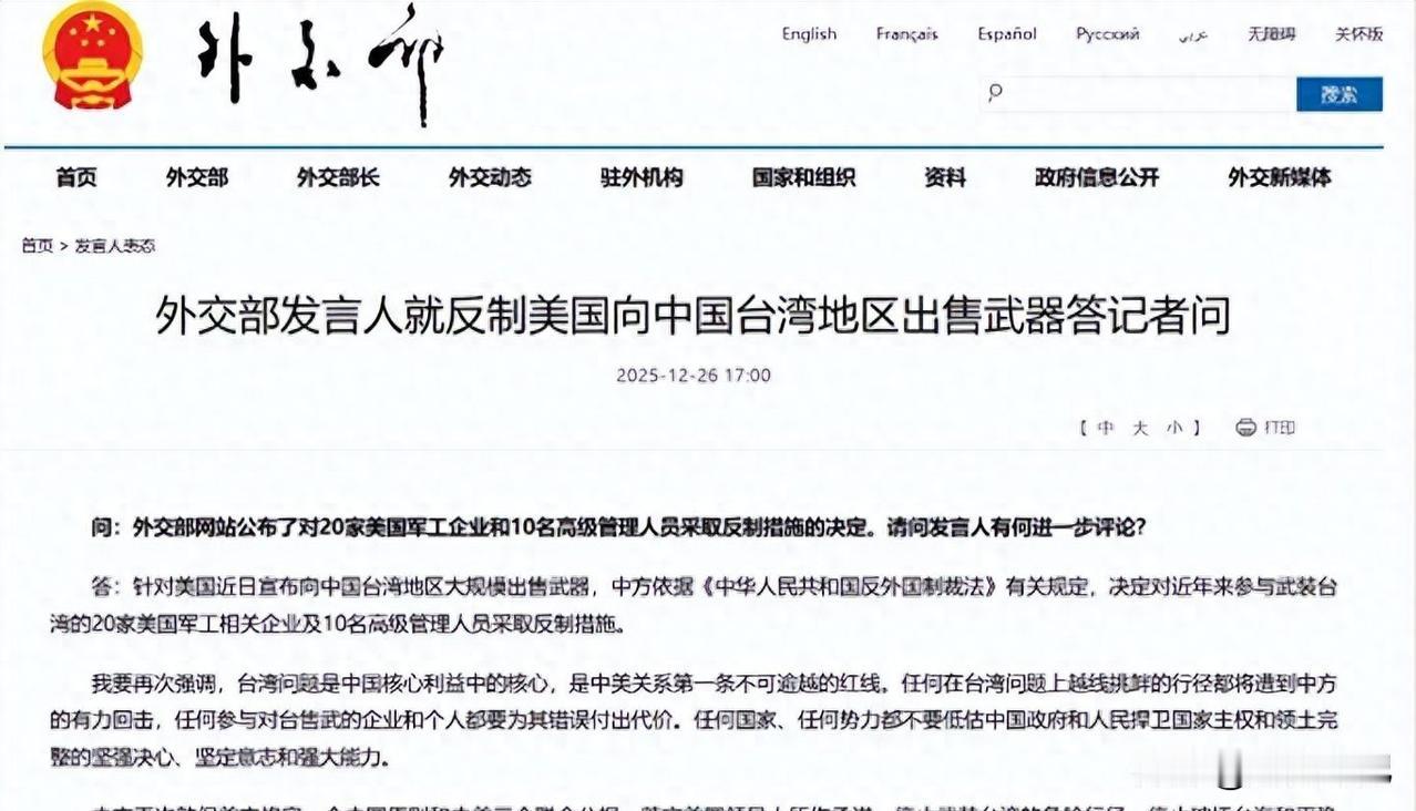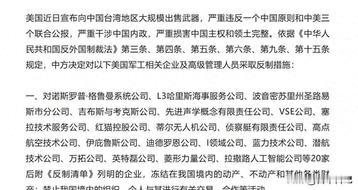 8天沉默后中国突放大招:20家美企被封,背后暗藏惊人布局 你盯着棋盘看,对方纹丝不动,你以为他认了,结果下一秒,一记杀招直接端了你老窝。这事儿真发生在国际场子上,而且就在这几天。12月26日,北京一声不吭地甩出一张名单,一口气拉黑20家美国企业,连人带公司一起封。这事乍一听像例行反制,细扒才发现,不是发脾气,是动真格的清算。 美国那边12月17号高调宣布对台军售,超110亿美元的大单,什么“进攻性装备”“体系化作战”这些词都甩出来了,摆明了踩中国底线。中方当天就表态了,话也不软,红线划得清清楚楚。可华盛顿那帮人照旧当耳旁风,估计心里念叨着:抗议归抗议,生意照做,军工集团照拿钱,岛内政客还能接着画饼充饥。他们习惯了这种“雷声大雨点小”的剧本。 但这回北京没按套路出牌。整整8天,不吵不闹,外交部几乎没密集发声,媒体也压着节奏。表面风平浪静,实则是在等——等军售流程走完,等美方自己把退路堵死。这8天不是软弱,是蓄力,是确认:你真要玩,那我就不客气了。 12月26日这一天,反制落地。名单一出,业内人士倒吸一口凉气。诺斯罗普·格鲁曼、波音密苏里分公司这些巨头在列,但更狠的是那些不起眼的“螺丝钉”公司。有的专攻无人机智能算法,有的负责电子战信号识别,还有的提供海洋情报链支持。单独看都不起眼,合起来却是整条对台军售技术链的“血液中枢”。中方这次不打脸面,专切命脉,精准得像手术刀划开动脉。 更狠的还在后头。10名美国军工企业的核心高管被点名制裁。以往这些人躲在公司后面,风险由政府扛,分红自己拿,日子过得滋润。现在不一样了,签证受限、资产冻结、出行处处碰壁,个人生活直接被挂上钩。这招一出,等于撕掉了那层“安全外衣”,谁还敢一边赚着挑衅中国的钱,一边还想来亚洲做生意、走中国市场? 这事其实还不止军工一条线。同时间段,13万吨美国小麦订单突然取消。别以为这是巧合。美国一向两手抓:军工集团吃肉,农业州喝汤,两头通吃。可中国偏偏不让它舒坦——你前面派军火商撩火,后面还想稳稳收粮款?哪有这种好事。这一手让不同利益群体都尝到滋味,尤其是那些早就绑在中国供应链上的制造商,像洛克希德·马丁、雷神,早前就吃过稀土断供的亏,这次再被点名,心里更明白:想靠中国市场发财,又在背后捅刀子,没门。 至于台湾那边,估计正从“护身符”的梦里慢慢醒过来。这些年鼓吹“花钱买安全”,可买的多是淘汰武器,真正担风险的却是自己。这次大陆直接掐住供货源头,等于撕开遮羞布:你以为抱的是大腿,其实那腿早就上了黑名单。 这8天的沉默,现在回头看才懂分量。不是退让,是把规矩立在这儿了——话我说到了,路你也走到了尽头,接下来,就得按我的规则来了。12月26日不是终点,而是新棋局的开局。下一次,反弹只会更准、更狠,你信不信?