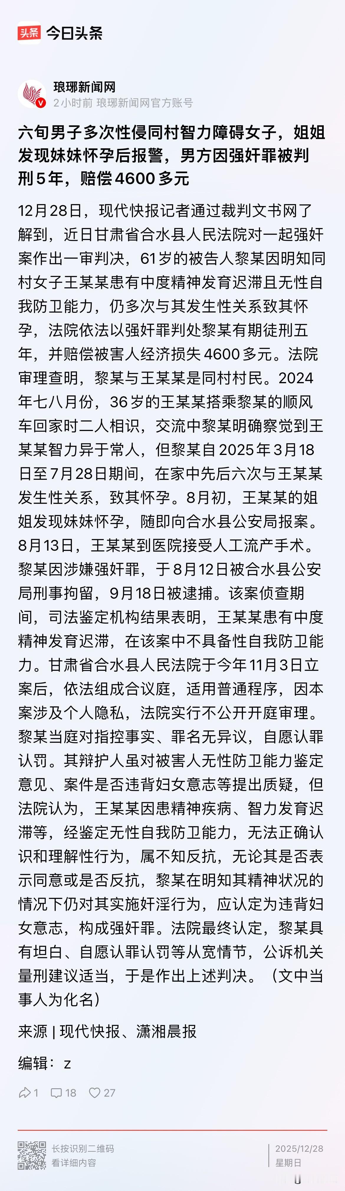 甘肃,一女子因怀孕被其姐姐发现,姐姐觉得妹妹既没对象又智力障碍,到底是什么人导致的,随即姐姐选择了报警,警方调查后,将同村一名61岁的男子抓获归案,男子承认先后六次和女子发生了亲密行为,最终,法院对男子判刑5年并要求男子赔偿4600元。 36岁的女子王某患有智力障碍,但是并不是很严重,平时也能外出买菜,也能打车回家。 24年夏天的时候,王某乘坐了同村六旬男子黎某的顺风车回家时两人相识,途中,黎某觉得王某智力异于常人,于是,从25年3月一直到7月,黎某先后六次和王某发生了亲密行为。 直到王某怀疑被其姐姐发现,姐姐觉得不可思议,怎么妹妹就怀了孕,随即便报了警。 很快,警方将黎某抓获归案,然而,黎某却提出,自己和王某都是在自愿的情况下发生的,自己没有强迫对方,言外之意,自己的行为不构成犯罪。 那么,黎某的行为真的不是犯罪吗? 其实,刑法规定的很清楚,采取暴力、胁迫或者其他方式,强行与受害人发生关系的,应认定为犯罪。 就是说,除了暴力和胁迫之外,还有其他的方式,那么,其他的方式到底是什么方式呢? 比如趁着受害人醉酒,或者是受害人严重疾病无法反抗,亦或者受害人根本不知道反抗。 对于什么是不知道反抗,其实就像本案一样,本案中,因为王某本身患有智力方面的疾病,所以,对于什么能发生,什么不能发生,自己根本没有一个大概,在这种情况下,王某就属于不知道怎么反抗的情形。 而经过司法鉴定,也确定了王某不具备自我防卫能力,所以,即便是王某自愿和黎某发生的,那么,在法律上,王某的自愿、甚至是同意都不算数,都一律认定是不同意、不愿意,在这种情况下,黎某的行为应认定为犯罪行为。 按照刑法第236条的规定,黎某将面临的是3年至10年不等的有期徒刑,法院在经过审理后,认为黎某有认罪认罚,以及坦白等情形,最终判决其有期徒刑5年。 但是,因为王某做了手术,产生了医疗费等费用,这笔费用也应当由黎某承担,最终又判决黎某赔偿王某损失4600元。 其实,有的自愿并非真的自愿,除了本案中的受害人属于无防卫能力之外,还有不满14周岁的女性说同意时,其实在法律上也是无效的,只要男性与之发生了,同样会被认定为犯罪的。 最后,其实对于这种无防卫能力人实施侵害,应当对其予以重判,更要加大量刑的力度,而不是对其减轻从轻处罚,不然等他出狱后,其实还具有再次实施犯罪的能力。 对此,你对本案有什么看法? —————————— 关注我,带你评析法律热点,关注冷暖人生。 文章原创,抄袭必究