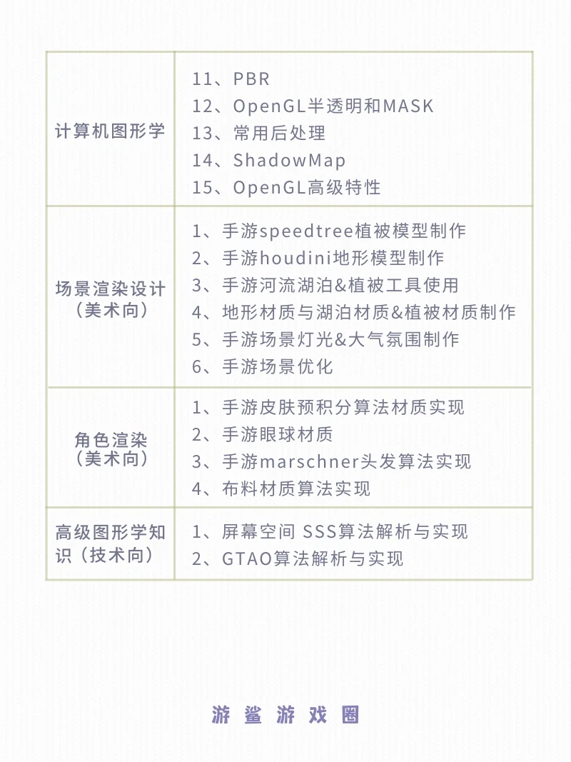 游鲨TA培训主要围绕技术美术通识能力、计算机语言、计算机图形学、场景渲染设计、角色渲染、高级图形学知识等展开,具体授课内容根据学生基础和需要定制。