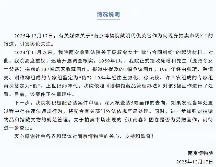 徐湖平被抓大快人心!徐莺假身份+家族劣迹,杭师大别装聋作哑 徐湖平被带走调查,全网都在喊大快人心!这个把南博当成自家仓库的前院长,把国宝《江南春》从“赝品”鉴定到低价倒卖,一手打造了“鉴定造假→划拨变现”的文物黑链,如今终于栽了,可这事儿远没到收尾的时候! 首先要查的就是他的家人!儿子徐湘江开着拍卖公司,刚好承接老爹倒腾出来的文物,从6800元的“赝品”炒到8800万的天价,这父子俩的利益链掰开来全是猫腻。徐湖平的妻子也一同被带走,这家人到底卷走了多少国宝,必须一查到底,绝不能放过任何一只蛀虫! 更让人膈应的是徐莺这个跳梁小丑。一个学植物病毒的理科生,愣是靠伪造“庞家后人”身份混进文博圈,还顶着假身份拿下美院博士、当上杭师大副教授。法院早判了她身份造假,她却照样平步青云,背后没人撑腰谁信?更别提她祖上还把数万册古籍卖给日本外务省,倒卖文物简直是“家学渊源”,现在又掺和进南博文物案,这水到底有多深? 杭州师范大学别再装聋作哑了!徐莺靠着造假身份混了11年教职,校方对她的黑历史视而不见,官网甚至还标榜她的“书画研究”头衔。学术圈的底线呢?文博圈的公信力呢? 徐湖平的落网只是开始,揪出他背后的亲属团伙,查清徐莺造假的深层勾结,让杭师大给公众一个交代,这才是对流失国宝、对被骗的庞家后人、对所有关注此事的人最基本的回应! 大家觉得这个事最后会揪出多少耗子来?