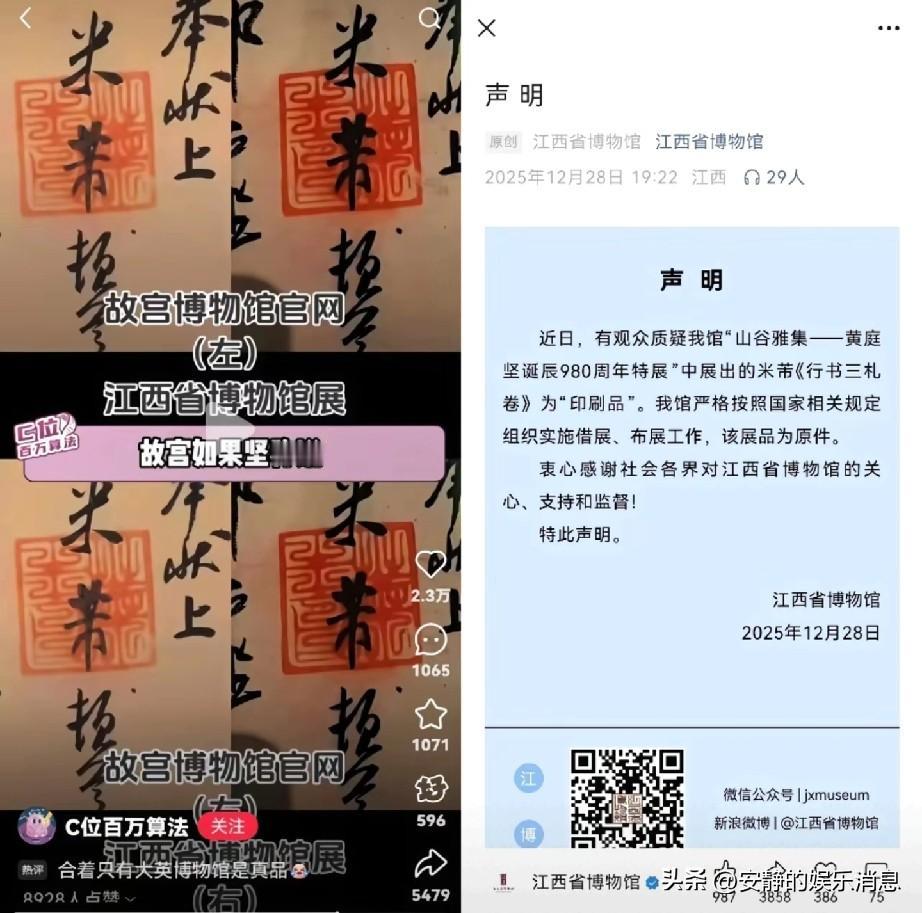 自从南京博物馆出事以后, 现在各地博物馆仿佛惊弓之鸟。 估计这是谁也没有料到的吧! 江西博物馆近几日又出事了,直接被曝出展出真迹竟然是假品!事情是这样的,江西博物馆在展出米芾真迹作品的时候,有人就发现不对劲了:这幅作品的字体没有墨色变化,应该是干湿分明的地方没有一点儿变化;按理说印章压在字体上面,但是这字体却在官印上面,这在书法作品中是不符合常理的。 江西博物馆随后赶到现场查看,依然坚持自己的展品是原件,并且有借展单位的书面证明,不可更改!对于江西博物馆的回应,现场的书法爱好者表示不能接受,并认为文博场馆不应该这样对待前来观看的群众! 专家也表示,作品确实有非常规之处,但无法确认真伪。此事一出,网友们都炸了:文博场馆怎么能这样!不能让你们文博场馆这样欺骗我们老百姓啊!以后借展前先鉴定真伪,最好不要出现这样糊弄人的事情!