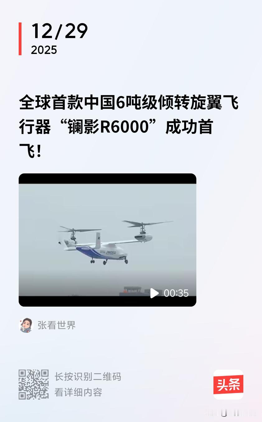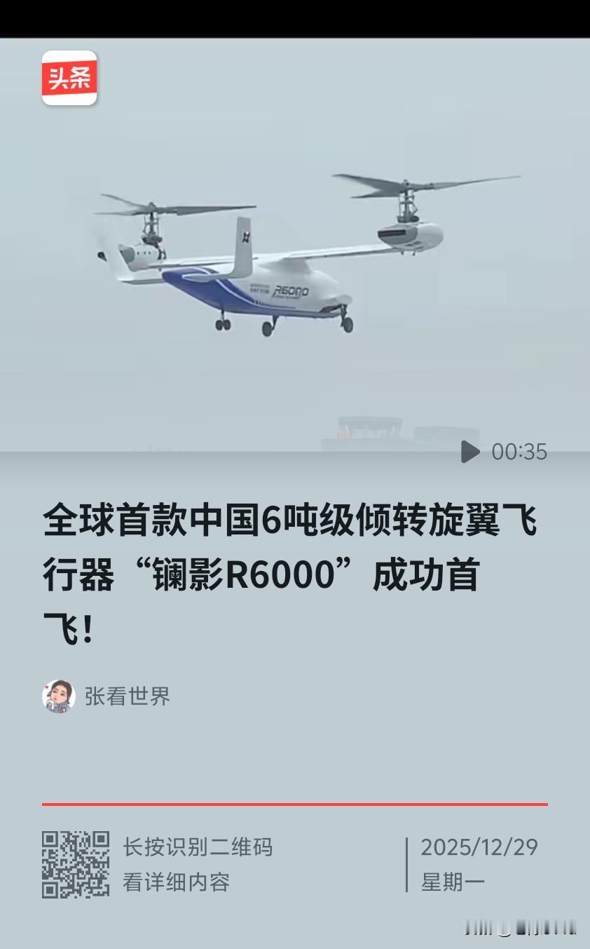 2025年12月28日,联合飞机集团自主研制的全球首款6吨级倾转旋翼无人飞行器“镧影R6000”在四川德阳什邡市圆满完成首飞,标志我国在倾转旋翼技术上取得关键突破。 技术亮点 ● 倾转旋翼设计:通过高集成度机电作动系统与先进飞控系统协同,让旋翼姿态在垂直起降与高速平飞模态间无缝、安全平稳切换,兼具直升机垂直起降、精准悬停和固定翼飞机长航程、大载重、高速巡航的优点。 ● 先进的系统与材料应用:搭载有自主知识产权的智能倾转与飞控系统,全权限数字飞控计算机能进行高度智能化的多模态切换与故障自适应;采用高性能涡轴发动机(我国自主研制的AES100发动机)与先进复合材料桨叶,实现动力、效率与静音性的最佳平衡。还广泛运用轻量化复合材料及一体化成型技术,降低自重同时保证结构强度,提升运营经济性。 ● 独特构型设计:采用先进的倾转旋翼轴,非完全旋转整个发动机短舱。这种构型可避免发动机尾喷高温气流在起降阶段伤害飞机机身侧面上下机人员,也不会对无防烧蚀层的海上动平台表面产生高温烧蚀,利于在普通海上动平台起降。 ● 创新机翼和桨叶技术:具备机翼纵列式折叠与桨叶收折技术,大幅缩减停放占用面积,解决了传统固定翼飞机狭小区域部署难题,提升空间适应性和部署灵活性。 性能优势 其性能数据全面超越传统旋翼机:固定翼模式下巡航速度达550公里/小时,是传统直升机2倍;最大商载2000公斤,远超同吨位直升机;最大航程4000公里,为传统直升机4倍;实用升限7620米,是传统直升机2倍。 应用领域广泛 ● 高端立体交通:可服务省际点对点通勤、跨海航线及山区运输,减少时空距离,助力构建跨区域“门对门交通圈”。 ● 应急救援:能在医疗急救、消防救援、警务巡逻及大规模抢险救灾中,快速精准投送人员与物资。 ● 其他领域:还可用于航空物流、特种作业、海上平台通勤、航空测绘、高端私人出行与空中观光旅游等。 行业与产业意义 ● 技术发展里程碑:标志我国在倾转旋翼机领域实现一系列核心关键技术自主突破,高端航空装备从技术追赶迈入自主创新新阶段。为全球倾转旋翼技术产业化提供首个大规模应用级解决方案。 ● 推动低空经济发展: 使我国低空经济迈入规模化、产业化发展新阶段,牵引高端材料、精密制造、运营服务等全产业链升级,催生城市空中交通新业态,为低空空域管理改革、适航标准制定提供关键实践支撑。 ● 带动地方产业升级:四川是我国重要航空产业基地,“镧影R6000”落地为其注入新活力,吸引全国顶尖航空材料、飞控航电、动力系统等领域企业和研发机构集聚。未来十年,围绕该机型形成的配套产业规模预计超100亿元。