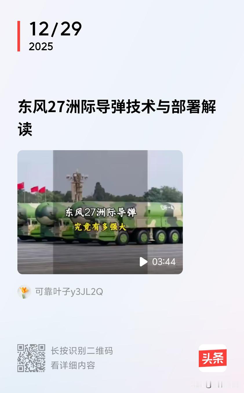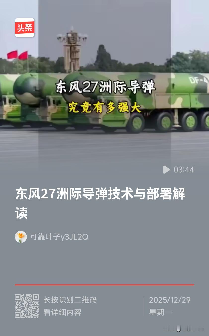 东风 - 27远程弹道导弹是一种中远程高超音速武器,以下是它可能具备的技术特点: 1. 高超音速飞行能力:它被美军认为是一款高超音速导弹,外媒称其在2023年8月的测试中末速达到15马赫。这种极快的速度使得导弹在飞行过程中能迅速抵达目标,大大压缩了敌方的反应时间,增加了拦截难度。 2. 较远的射程:设计射程在5000到8000公里之间,其覆盖范围从中国大陆延伸至关岛甚至更远的太平洋中部,能够有效打击第二岛链内的关键目标,展示了对第二岛链以外目标的威胁能力。 3. 精准打击移动目标能力:有消息称东风 - 27可能基于东风 - 17改进而来,东风 - 17能够精准打击移动目标如舰艇,2023年外媒报道东风 - 27准确命中了5000公里之外海上移动目标,这说明东风 - 27具备远距离打击海上移动目标的能力,例如航母等大型舰艇,具备远距离反航母能力。 4. 多种弹头搭载能力:可以携带常规或核弹头,这使得它在作战使用上更加灵活,能够根据不同的作战任务和目标性质选择合适的弹头,以达到最佳的打击效果。