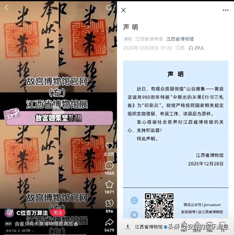 江西博物馆展出米芾真迹,被江西书法爱好者团团围住,看着这真迹仿佛是假的。 这次江西博物馆展出这幅真迹,肯定会吸引很多书法爱好者前去观摩学习。要是假的,那可就太有说法了!前有南京博物院出事,各地博物馆都变得很紧张,没想到现在又有人质疑江西博物馆。 米芾真迹被曝是假品,这幅字有几个地方不对劲:第一,米芾的作品墨色变化很自然,而这幅字的字体看起来很生硬,像是用电脑打出来的一样。第二,印章的位置也不对,正常情况下,行书的印章应该盖在字的上面,而不是字在印章的上面。 江西博物馆表示这幅字是原件,并且有书面证明。专家也表示,就算这幅米芾作品看着有地方不太对劲,但就凭只一点也无法确认真伪。
