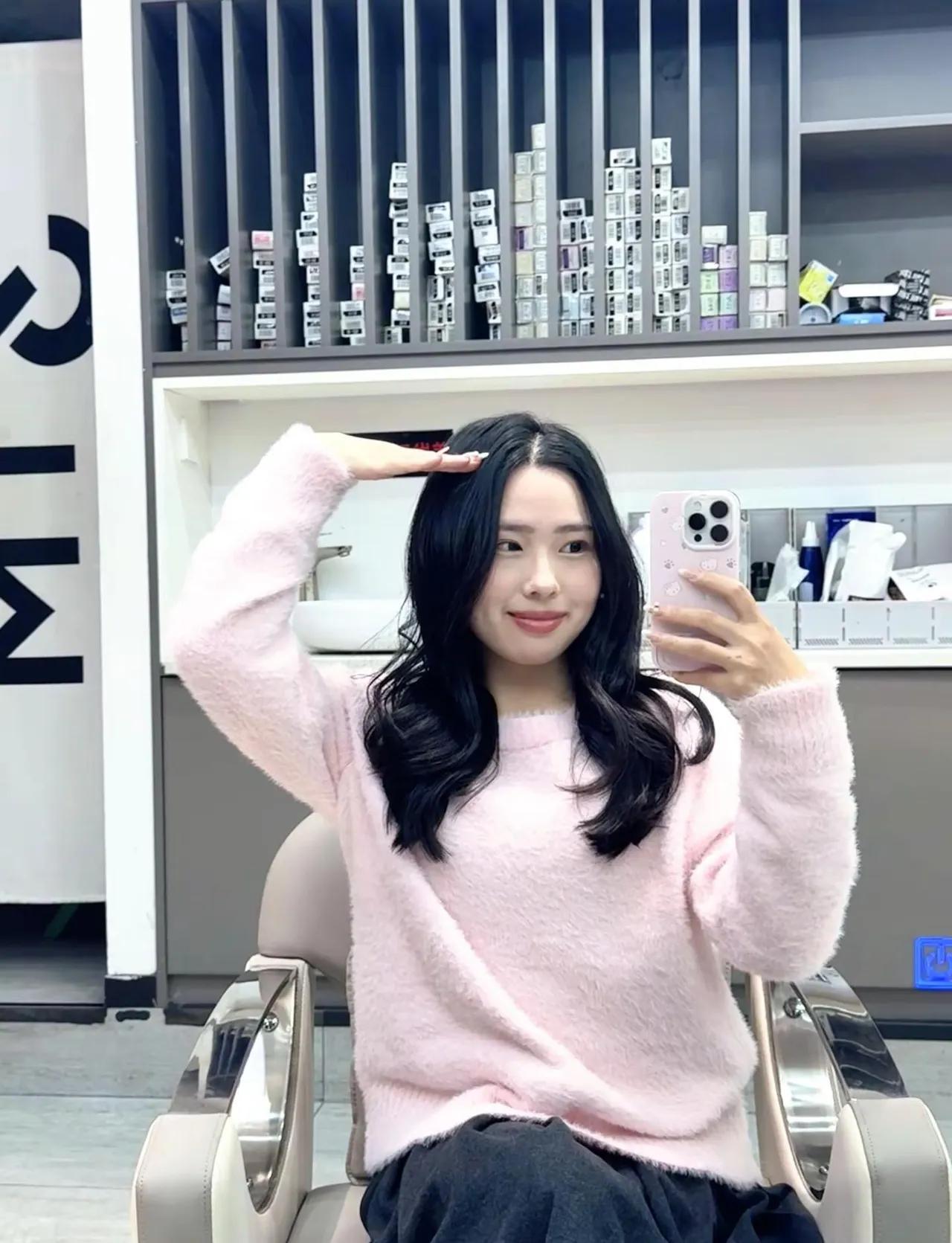 镜中人影,粉衣映笑颜。