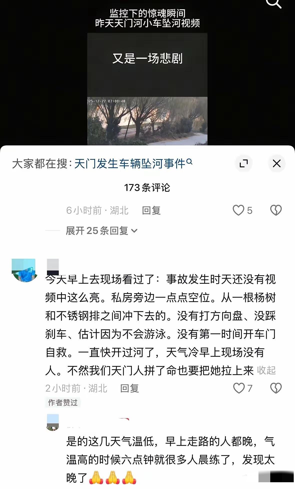 湖北天门,冲入河中的新能源女车主才26岁,她刚拿驾照不久,准备驾驶小车去上班的。没想到,还在半路上,人就出事了。 这位26岁的姑娘是湖北天门本地人,99年出生,年纪轻轻还没有成家,正是人生最美好鲜活的阶段。她的驾照刚拿到手没多久,属于实打实的实习期新手,出事当天开的那辆新能源车,更是事发前一两天刚提的新车,车是新的,驾照是新的,满心期待开着新车去上班,这份美好,却在清晨的上班路上,戛然停住了,想想都觉得心疼。 事发的具体时间是12月27日早上7点,早高峰的时段,地点就在天门接官路星星大桥与船闸桥附近的滨河路段。现场的监控画面记录下了全过程,她的车行驶中全程没有出现刹车的动作,刹车灯自始至终都没有亮起,车子稳稳的朝着河边行进,冲过路沿的小坡之后,直接扎进了河里,不过短短几秒,整辆车就彻底沉入水底,速度快到让人根本来不及反应。 周边的路人发现情况后,第一时间就大声呼救、拨打救援电话,消防和应急救援人员赶到的速度也很快,只是现场的救援难度远超想象。围观的群众看着救援人员全力打捞,所有人都揪着心,可最终的结果还是让人难以接受,年轻的姑娘还是没能被救回来,一条鲜活的生命,就这么没了。 有天门当地的知情人透露了更让人心酸的细节,这位姑娘出事前,在路口转弯时差点撞到外卖小哥的车,她当时还跟外卖小哥解释,自己前天才提的新车,还在练车阶段,不太熟悉车况。能看出来,她对这辆新能源车的操作,完全处于陌生的状态,油门的轻重、刹车的反馈、车辆的提速节奏,她都还没摸透,只是单纯凭着驾照的基础,就敢开着新车独自上路通勤。 警方目前已经介入事故的全面调查,已经明确排除了酒驾、毒驾的可能性,结合现场的监控和实际情况来看,这次事故的核心诱因,大概率就是新手最容易出现的操作失误:油门与刹车的误踩。这不是凭空的猜测,而是新手驾驶新能源车的高频事故诱因,没有半点夸张的成分。 大家一定要清楚,新能源车和传统燃油车的驾驶感受,完全是两回事。新能源车的电门响应速度极快,几乎是脚踩下去就立刻提速,没有燃油车的动力延迟,车身自重也比同级别燃油车更沉,刹车的反馈力度和制动距离都不一样。很多新手拿证后,觉得自己能驾驭车辆了,却忽略了这种车型差异带来的操作风险,这是最致命的问题。 近几年新能源车的新手事故率持续偏高,根源就在这里。新手司机对驾照的认知有偏差,总觉得拿到驾照就等于掌握了驾驶技能,却忘了驾照只是入门凭证,真正的上路经验,是需要慢慢积累的。贸然开着不熟悉的新能源车独自上路,遇到突发情况根本来不及反应,慌乱之下踩错踏板,就很容易酿成无法挽回的后果。 更让人无奈的是,新能源车落水后的逃生难度,要比燃油车大得多。车辆坠入水中会快速沉底,河水产生的水压会瞬间把车门牢牢顶住,单凭个人的力气根本打不开。新能源车的车窗基本都是电动升降设计,入水后车辆电路一旦遇水短路断电,车窗就彻底失去了升降功能,就算想砸窗逃生,新能源车的车窗多是双层夹胶玻璃,没有专业的破窗工具,普通人根本砸不破,这也是这次救援难度大的核心原因。 我从来都不想苛责逝去的人,这件事里,这位姑娘只是一个普通的新手,她没有任何主观的过错,可这件事带来的警示意义,却值得所有人记在心里。现在考驾照能让我们掌握基础的驾驶规则,但道路上的突发状况、不同车型的驾驶差异,这些都不是驾校能教完的,也不是一本驾照能涵盖的。 太多新手都有一个通病,拿证就急于上路,买车就急于开出去,对自己的驾驶水平盲目自信,对道路风险却视而不见。这种心态,不管开什么车,都是悬在头顶的一把利剑。刚拿驾照的实习期,本就是积累经验的阶段,哪怕技术过关,心态上的沉稳和对道路的敬畏,也需要慢慢打磨。 新手开新能源车,一定要先找老司机陪同练车,在空旷路段把车辆的性能摸透,把油门和刹车的脚感练熟,别急着上主干道,更别贸然开着新车走临水、临崖的复杂路段。开车通勤本是为了方便生活,不是为了赌上自己的安全。 生命从来都经不起半点侥幸,26岁的年纪,本该有无限的未来,却因为一次意外画上句号,这是一个家庭一辈子的伤痛。开车无小事,安全永远是唯一的底线。新手要稳,老手要慎,敬畏道路敬畏生命才是每个司机都该守住的初心。 各位读者你们怎么看?欢迎在评论区讨论。