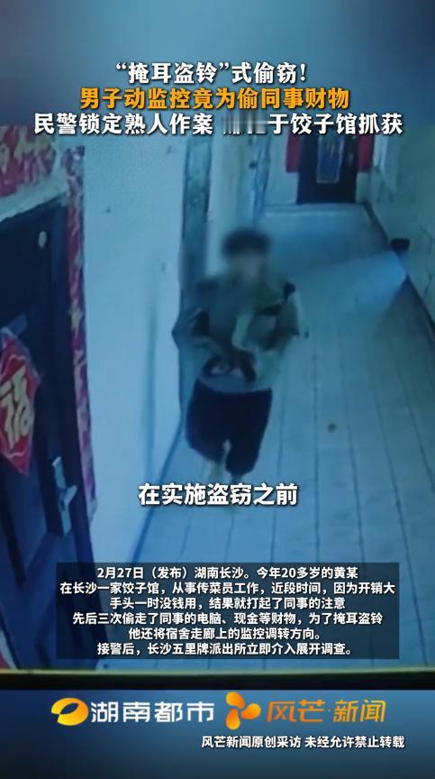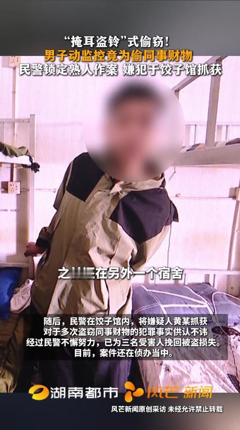 “自作聪明!”近日,湖南长沙,一小伙因缺钱花,就打起了同事的主意,在盗窃之前,他还特地将走廊内的摄像头向上拨动,民警调查后发现小伙的嫌疑很大,进入房间后就看到了失窃的电脑,最终将其抓获。网友:好一个掩耳盗铃! 现在不少年轻人花钱大手大脚的,只靠工资难以满足巨大的开销,对于那些法律意识薄弱的人来说,很容易就走上违法犯罪的道路。 据媒体12月28日的报道,黄某是个00后,由于学历不高、没什么手艺,他只能在一家饺子馆当服务员,可是这份工作的收入并不高,再加上他这段时间花钱的地方很多,很快就囊中羞涩了。 在此情形下,黄某铤而走险,将罪恶的黑手伸向了同事,他趁别人都在上班的时候,偷偷溜进宿舍,为了不被摄像头拍到,他还特地调整了摄像头的位置。 等到同事回宿舍后,发现笔记本电脑不见了,于是立即报警。民警赶到现场侦查,很快就排除了外来人员作案的可能,而且在其他监控中发现,黄某离开宿舍时手里提着什么东西。 最终民警将黄某抓获,还在其房间内找到了电脑,随着警方的审讯,这才发现黄某此前还盗取过其他同事的现金,没想到这次还有意外的收获! 网友看后表示,好一招掩耳盗铃,真是愚蠢到家了,这么明显的操作很难不让人怀疑。 信息来源:《“掩耳盗铃”式偷窃!男子动监控竟为偷同事财物民警锁定熟人作案嫌犯于饺子馆抓获。》风芒新闻