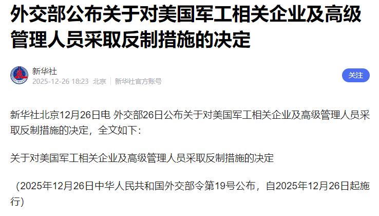 中国出手了。 北京方面释放明确信号,这回的意思很直白:不跟你吵架了,直接让你“断粮”。 做法也不是一张纸吓唬人,而是一套组合动作。先把相关美国军工企业的资金和人员往来卡住,再用稀土这一条关键供应链去掐它们的生产命门,让它们不是“难受一下”,而是“真干不下去”。   近期,美国不顾中方反复警告,执意宣布向中国台湾省出售武器,规模高达110亿美元,这种严重干涉中国内政、损害国家主权的行径,彻底触碰了红线。面对如此挑衅,中国忍无可忍、毅然出手。   12月26日,外交部正式公布对美国军工相关企业及高级管理人员的反制决定!   根据外交部公布的决定,这次被反制的有20家美国军工企业,还有10名企业高级管理人员。具体来说,这些企业在我国境内的动产、不动产和其他所有财产都会被冻结,国内任何组织和个人都不能再跟它们做交易、搞合作。   而那些高管,不仅在华财产会被冻结,国内没人能跟他们个人做业务,更重要的是,中方不会给他们签发签证,不准他们进入中国境内,包括香港和澳门。   这就意味着,这些企业想在华捞钱、开展业务彻底没戏,高管们也被彻底挡在了中国门外,往来交流全被切断。   当然,光卡住资金和人员显然也不够,我们还有更关键的后手,那就是用稀土这条关键供应链,掐住这些军工企业的生产命门。   而在全球稀土供应链里,中国的地位无可替代。从已知的储量来看,中国稀土储量占世界近一半,2024年的产量更是占到全球的69%,是美国产量的六倍还多。   更关键的是,稀土开采后需要复杂的分离、精炼才能变成可用的材料,这个环节的技术难度极大,而中国在这方面的市场份额超过90%,几乎掌控了全球的核心加工能力。   美国虽然也有少量稀土开采,但自己根本没有商业化的重稀土分离厂,大部分矿石还得送到中国来加工,想要自建工厂还得好几年才能投产,且成本短期内业根本无法降低。   这就意味着,一旦我们在稀土供应链上收紧,这些被反制的美国军工企业就很难拿到合格的稀土材料。没有稀土,生产线就会陷入停滞,不是暂时难受一下、产能下降一点那么简单,而是很可能彻底无法开工,真的干不下去。   现代军工生产环环相扣,少了稀土这个关键环节,再先进的技术、再充足的订单也没用,这就是最直接的“断粮”。   台湾问题是中国的核心利益,美方一再武装台湾,破坏台海和平稳定,就必须付出代价。   这次的组合动作,既体现了中方捍卫主权的坚定决心,也展现了我们精准反制的实力,让美方清楚地知道,任何挑衅都不会有好结果。
