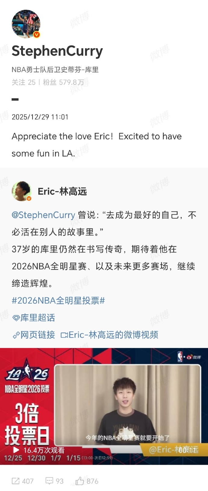 库里回应林高远好家伙,这不就是强者间的惺惺相惜林高远三倍投票日为库里全明星拉票,还引用偶像的话夸 37 岁的他续写传奇,直接被库里翻牌回复 “Appreciate the love Eric!”运动界梦幻联动,英雄惜英雄,愿两位大神各自主场再创佳绩!NBA破界玩家