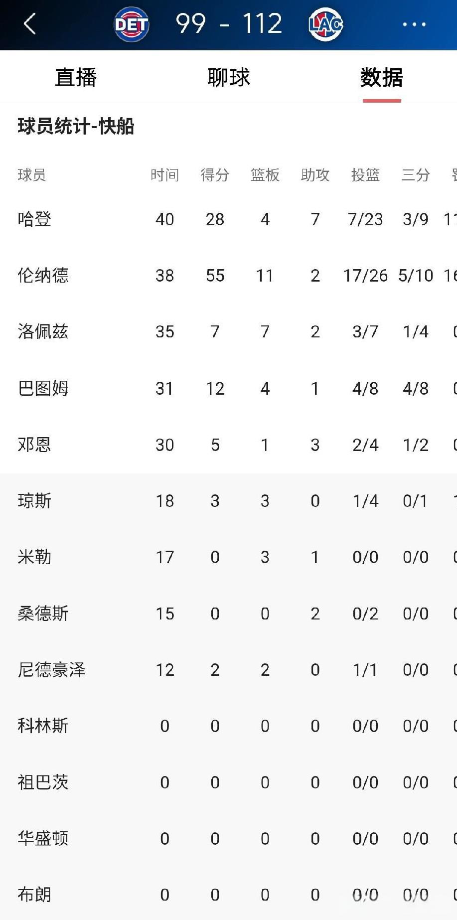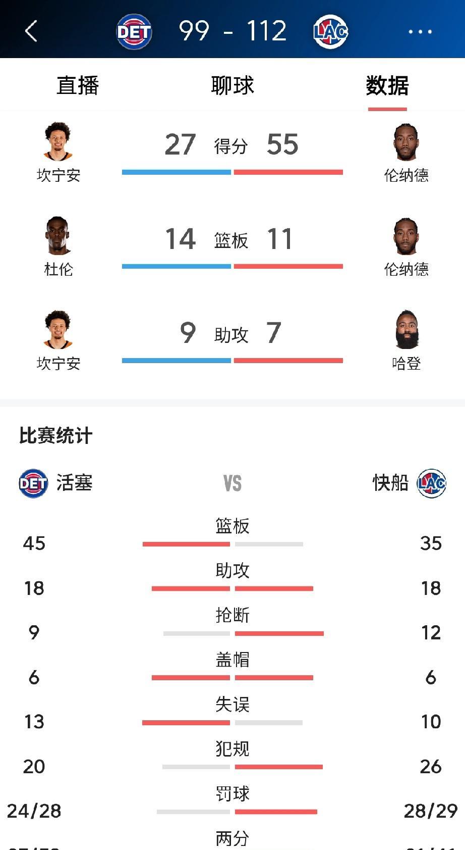 卡乔丹大爆发,砍下55分,送东部第一活塞两连败。55分是本赛季单场个人第二高分,仅次于约基奇的56分,但是快船的比赛没有加时,含金量更高。 今年的活塞可不一般,坎宁安和杜伦一内一外愈发成熟,哈里斯焕发第二春,邓罗、汤普森和斯图尔特发挥稳定。因此活塞战绩惊人,在东部遥遥领先。但近期活塞来到不好惹的西部,5连客之旅变得越来越不美好。在接连拿下开拓者和国王后,来到爵士主场吃了瘪,129-131两分惜败,不但让马尔卡宁和乔治双双拿30+,还让老将乐福开个荤,拿到14分5板3助,防守那是真糟糕。 似乎是爵士的消耗战挫灭了活塞的锐气,本轮到了快船主场,活塞更加低迷,除了坎宁安和杜林,只有替补艾薇1人拿到2位数得分(11),可见其余球员状态多糟。角色球员不发挥,这也让坎宁安的27分5板9助和杜伦的18分14板显得微不足道。活塞低迷,那快船可不不会手下留情,抓住机会在主场大开杀戒,伦纳德26投17中,三分10中5,在38分钟出场时间里狂砍55分11板2助5断3帽,创赛季个人得分记录,也创下了联盟单场个人第二高得分记录。哈登也拿到28分4板7助。在二人带领下迎来4连胜的快船重燃季后赛希望。