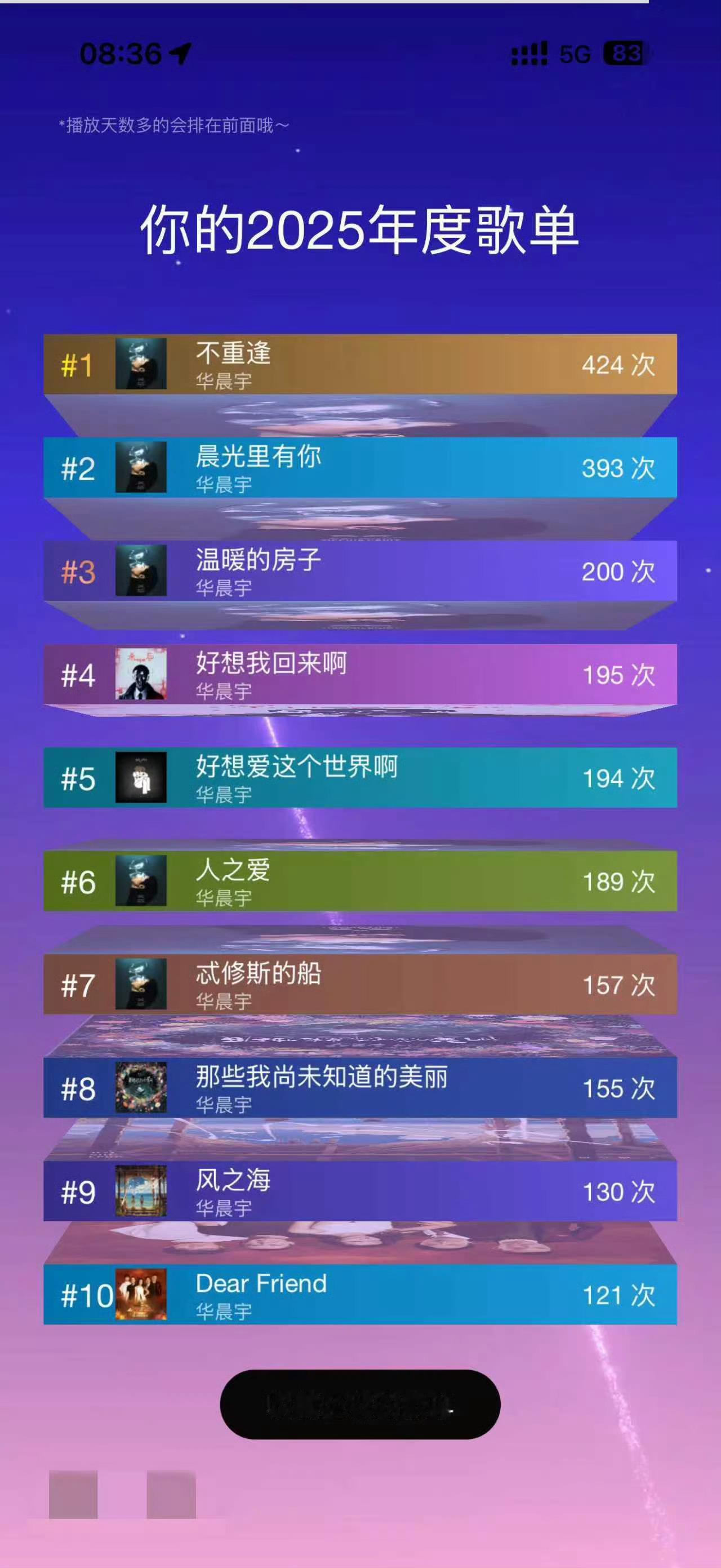 年度报告华晨宇含量极高2025的快乐是华晨宇给的!听歌时长2000+分钟,专辑《量变临界点》反复循环,从音乐里get勇气与温柔,这样的年度歌手值得一辈子喜欢!