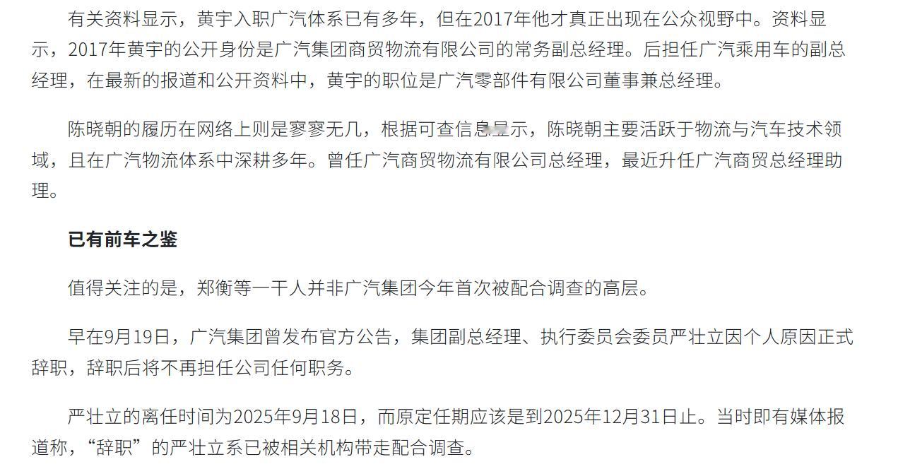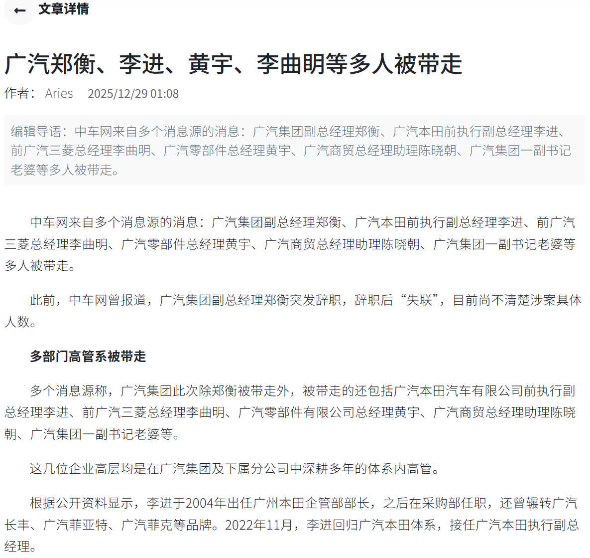 【中车网:广汽郑衡、李进、黄宇、李曲眀等多人被带走】中车网这个信息有点劲爆。 不过这就让消息有一定合理性了。郑衡才刚刚上任没几个月这个从侧面反映广汽集团现在越来越难了,有点像东风,反腐大事一个接一个,抓了不知道多少个了,早就超过两位数了这对广汽来说,不是什么好消息中车网,主要团队既有具有20余年中国一流财经汽车媒体从业经验的资深媒体人,也有热情洋溢、充满朝气的90后,凭借一流的原创文章,在中国汽车业有较高知名度和广泛影响力,被誉为“中国汽车业的《财富》”。销量方面,广汽集团这些年状态越来越差,销量也在走下坡路,广汽本田,广汽丰田,两家日系合资品牌,显然受到了中日关系的影响,长期看,这两家合资公司在中国只会越来越难,好不起来