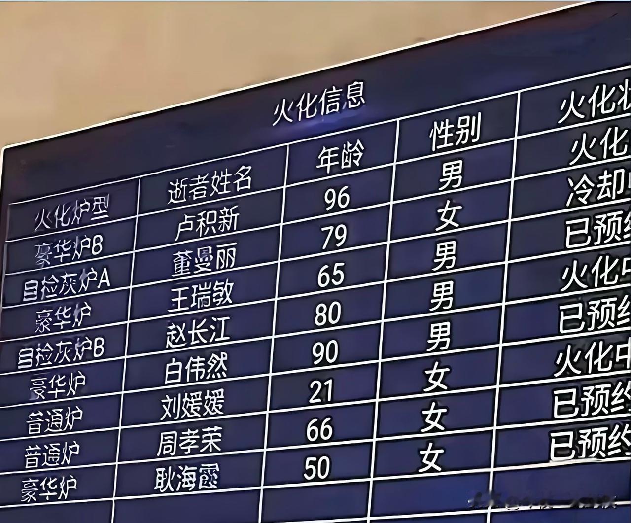 黄泉路上无长幼。 那个九十六的长寿老人,叫寿终正寝,人生应该没有遗憾了。 那个五十的中年妇女呢?还没有退休,可能子女还没有成家,很不甘心的。 那个二十一岁的女孩儿呢?英年早逝,内心得有多少挣扎和不甘呀?!连我们看了都心疼。 人终究还是分了三六九等,连死后被烧的那团火都有贵贱之分。