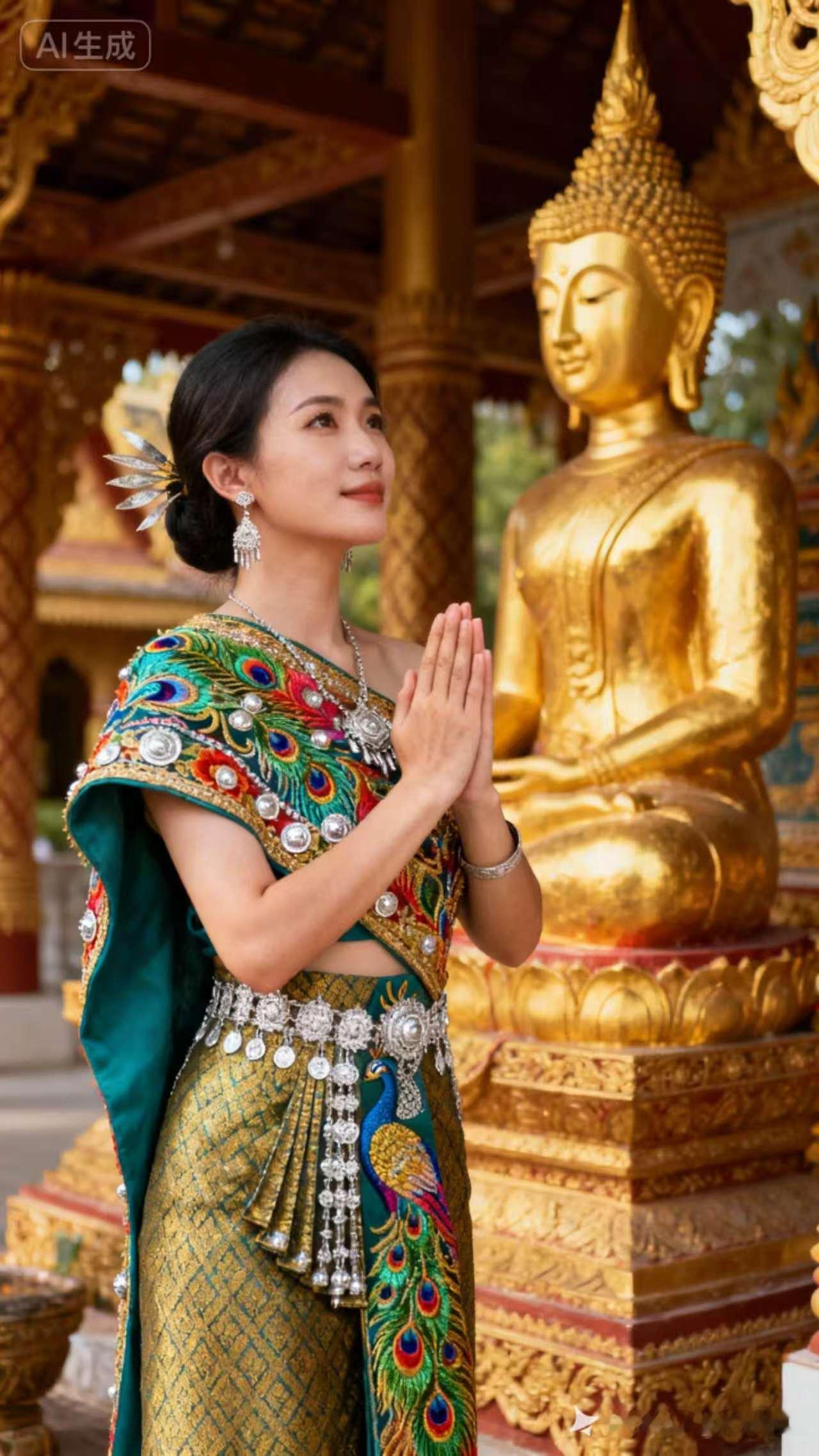 在金色佛像前,身着传统服饰,双手合十,感受宁静与祥和。