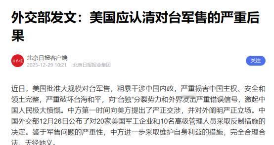 美国务院发火,要求中方“必须停止”,但3个细节彻底暴露底牌 26日,中国外交部宣布对参与“对台军售”的20家美国军工企业和10名高级管理人员采取反制措施,美国国务院一下子就急了。据美媒报道,在中方反制措施发布后不久,不具名的美国务院发言人就做出了表态,声称“强烈反对中方举措”,理由是“9届美国政府都在台海问题上的政策保持着一致,这有利于维护台海和平稳定”,并提出了一个离谱要求——中国大陆必须停止对台施压,转而开展有意义的对话。 这里面最明显的就是美方提的 “9 届政府政策一致” 这个说法,简直是自欺欺人,明眼人一看就知道是在硬撑场面。中美三个联合公报里早就写得明明白白。 美方承诺过要逐步减少对台军售,最后彻底停止。可这所谓的 “一致政策”,说白了就是一届接一届突破承诺,不停给台湾卖武器。这次更过分,直接抛出 111 亿美元的军售大单。 里面有 82 套 “海马斯” 火箭炮系统、60 门自行榴弹炮这些大杀器,还有台湾之前花大价钱买的 “鱼叉” 反舰导弹。这些武器都是能直接让台海局势变紧张的东西。 这次被制裁的诺斯罗普・格鲁曼公司,给台湾的 F-16V 战斗机装了核心的有源相控阵雷达。波音圣路易斯分公司更直接,就是生产对台军售关键武器的。 这些企业没一个不是靠着对台卖武器赚得盆满钵满。美方嘴上说政策一致是为了和平,实际上却是在一条破坏和平的路上越走越远。现在中方一出手反制,他们就拿这个站不住脚的理由来辩解。 说白了就是没别的办法,只能靠编造 “一致性” 给自己壮胆,生怕别人看穿他们长期违背承诺、故意挑事的真面目。 美方发言人特意选择 “不具名” 的方式表态,这本身就透着一股心虚。按说中美关系这么大的事,要是美方真有理直气壮的底气,真觉得自己的主张站得住脚。完全可以让官方发言人公开露面,堂堂正正把立场说清楚。可他们偏要藏着掖着,不敢透露发言人的具体身份。 这背后的心思其实很简单,既想向中方施压,又怕把话说得太满收不回来。万一后续中方的反制措施升级,自己连个台阶都下不了。而且这种不具名的表态,本质上就是模糊应对。 既想煽动舆论,又不想承担明确表态带来的责任。生怕自己的言论被当成官方定论,反而束缚了后续的操作空间。反观中方,不仅公开了反制的企业和高管名单,外交部发言人还明确表态。 台湾问题是中国核心利益中的核心,是不可逾越的红线,任何越线行为都要付出代价。这种光明正大的态度和美方的遮遮掩掩形成鲜明对比,更说明美方所谓的 “强烈反对” 根本没有底气,只是表面强硬、内心发虚的虚张声势。 美方要求中方 “停止对台施压” 的离谱要求,才是最能暴露他们底牌的地方,他们就是想继续操控台海局势,又怕付出代价。谁都明白,台海局势变紧张,根源就是美方不停对台军售,给 “台独” 分裂势力递刀子。中方的反制措施,就是针对美方挑衅的正当回应。 这是依据《中华人民共和国反外国制裁法》采取的合法行动,目的就是遏制 “台独” 分裂行为,维护台海和平稳定。可美方倒好,自己干着破坏和平的事,反而倒打一耙,要求中方停止 “施压”。 更重要的是,美方之所以这么急着让中方停手,是因为这次反制正好打在了他们的要害上。被制裁的 20 家企业都是美国军工体系的核心力量,涉及装备制造、系统集成、前沿技术研发这些关键环节。 那 10 名高管更是企业的决策层,中方冻结他们在华的资产,禁止境内组织和个人跟他们做交易、搞合作,还不准这些高管入境。这对高度依赖全球化产业链的美国军工企业来说,打击可不是一星半点。 他们嘴上喊着反对,心里其实最怕中方的反制持续升级,影响他们的利益。所以才急不可耐地要求中方停手,本质上就是想继续毫无代价地搞 “以台制华”,把台湾当成战略消耗品,却不想让自己的军工复合体受损失。 再往深了想,美方这些年在台湾问题上的操作一直都是两套标准。一边通过 “台湾保证实施法案”“台湾国际团结法案” 这些国内法,试图架空国际法,歪曲联大第 2758 号决议,给 “台独” 势力站台。 一边又在国际上鼓吹所谓 “战略模糊”,不敢明确承诺会军事介入台海冲突。他们心里很清楚,中国大陆捍卫国家主权和领土完整的决心、意志和能力都不容低估。 五角大楼的多次兵棋推演也都显示,美军要是干涉台海,最后只会以失败告终。可他们还是舍不得放弃 “台湾牌”,总想通过对台军售赚大钱,同时消耗中国的发展精力。这种既想占便宜又怕惹麻烦的心态,在中方反制后暴露得淋漓尽致。