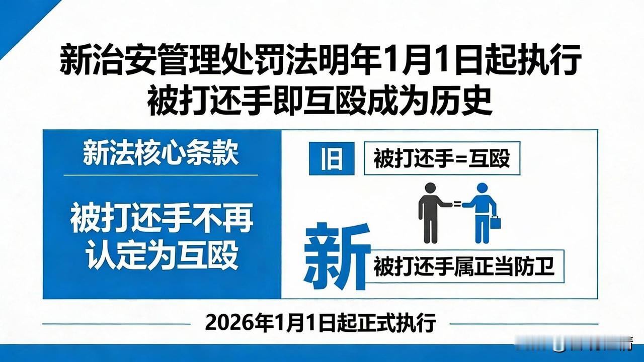 看到“还手不算互殴”的新规,我第一反应是,以后面对拳头,心里那根弦能松一点了吗? 想起以前看过的街头争执。A先推了B,B还手,警察来了,各打五十大板,统统带走。两人脸上是同样的憋屈。那一刻,先破坏规则的和被迫反抗的,在法律眼里成了“一伙人”。 新规试图画一条线。把先动手的混蛋,和保护自己的普通人,分开。执法的警察会更麻烦,要问前因后果。但这麻烦是值得的。它承认了一个简单的道理:坏掉的不是还手的人,是那个先破坏秩序的人。 法律不再要求你当打不还手的“圣人”。它开始理解,人被逼到墙角,血性是会涌上来的。它给你的,不是鼓励挥拳,而是当你不得不挡开拳头时,一份清晰的底气。 跑,还是第一选择。但万一跑不掉,你至少知道,身后站着的规则,终于开始尝试分清善恶了。 如果你的安全区被侵犯,你的第一反应会是什么? 正当防卫 新治安管理处罚法