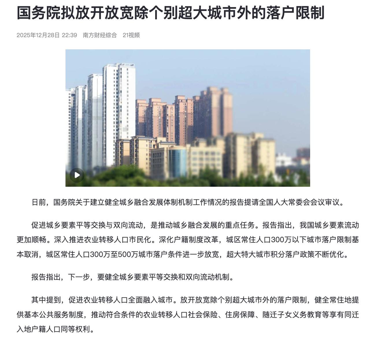 “零门槛落户”不再是梦,大多数城市已成现实! 国务院最新报告重磅确认:除个别超大城市外,将全面放开放宽落户限制,推动农业转移人口在社保、住房、教育等方面享有同等权利! 目前进展已非常明显,城区常住人口300万以下的城市落户限制基本取消,真正零门槛!300万—500万人口的城市条件大幅放宽,很多地方租房或稳定就业就能落户。 超大、特大城市积分落户持续优化,名额限制有望逐步放开,但仍保持一定调控。 全国600多座城市中,绝大多数已基本实现“愿落尽落”! 这波改革直接利好想去二三线城市就业、安家、养老的打工人和家庭。超大城市因资源压力大,仍是“特例”,但整体趋势是越来越包容。 目前超大城市有九个,顺序是:上海、北京、深圳、重庆、广州、成都、天津、武汉、东莞。上海是唯一超两千万人口的特大城市,东莞则是唯一非特区的地级市。