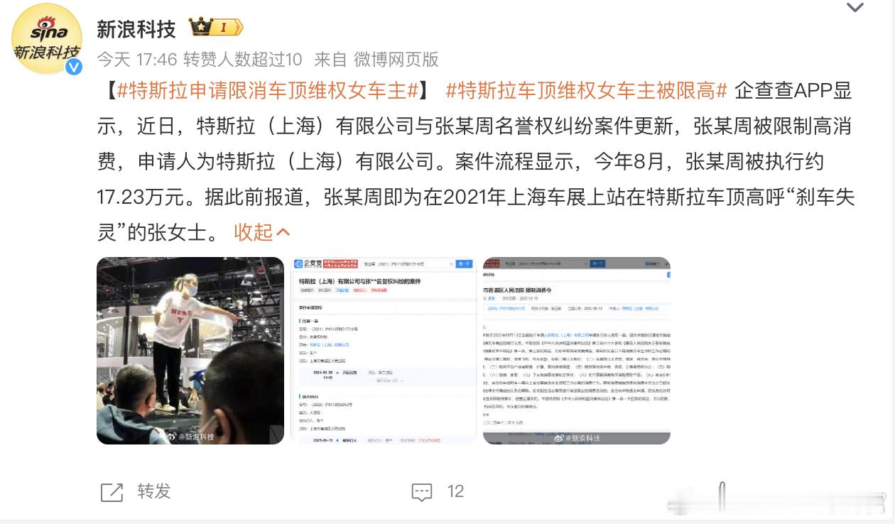 2021年站上特斯拉车顶喊“刹车失灵”的那位张女士,最近被限制高消费了,因为她和特斯拉的名誉权官司打输了,得赔的17.23万还没有赔再给大家梳理一下时间线:2021年车展,她爬上车顶维权,当时全网刷屏随后特斯拉反手告她名誉侵权,要500万,打了四年官司,今年7月最终判她赔17.23万但她同时也在告特斯拉,理由是“不提供完整行车数据”。今年9月,她这头赢了,法院责令特斯拉交出事故前30分钟完整数据。如今她因没付那17万,被限制高消费张女士曾说,拿到数据后,还会再做刹车鉴定,这件事情现在还是一个未完待续的状态大V聊车