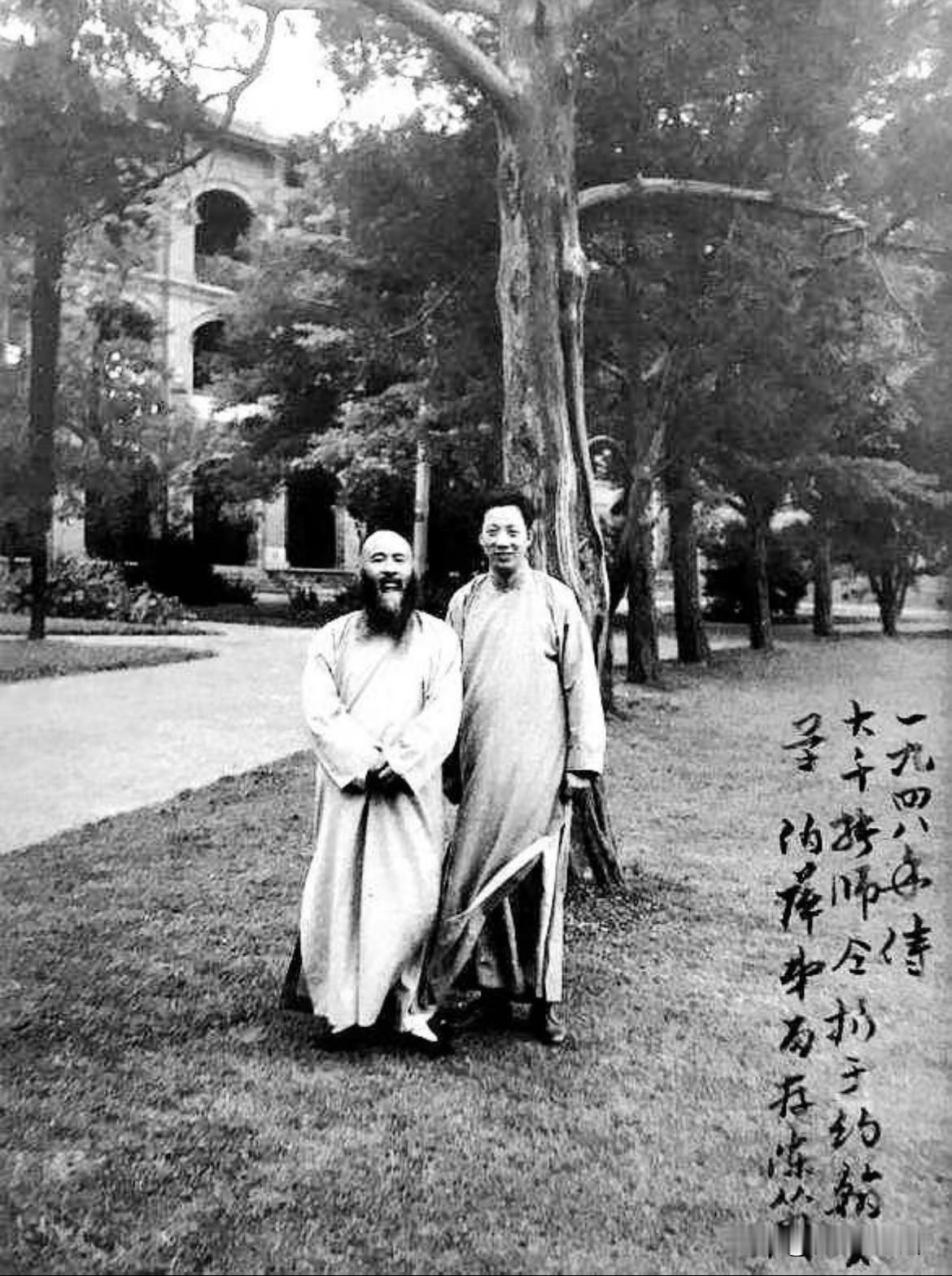 1948年,陈从周与师傅张大千在上海圣约翰大学校园拍摄的合影。这一年,陈从周正好30岁,已从之江大学文学系毕业多年,正在圣约翰大学任教。通过大金石家方介堪的介绍,他在上海女画家李秋君家中拜见了慕名已久的张大千,并成为张大千的入室弟子。