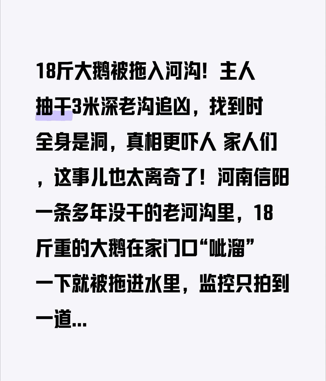 18斤大鹅被拖入河沟!主人抽干3米深老沟追凶,找到时全身是洞,真相更吓人 家人们,这事儿也太离奇了!河南信阳一条多年没干的老河沟里,18斤重的大鹅在家门口“呲溜”一下就被拖进水里,监控只拍到一道黑影,全村好几户的鹅都接连失踪,这到底是水怪作祟还是人为搞鬼? 当事人曹先生一开始还以为是大鹅自己跑丢了,调出监控一看直接脊背发凉——自家养了大半年的肥鹅,正在河沟边觅食,突然被水下一股力量猛地拽走,连挣扎的机会都没有,水面只冒了几个泡就恢复平静 。一打听才知道,村里已经丢了好几只鹅,有的比他家这只还沉,大家越想越怕:“这河沟深两三米,杂草又多,说不定藏着大家伙!” 为了避免再损失,曹先生只好忍痛把剩下的家禽都宰了。 可谁能想到,曹先生硬气起来直接借了两台潜水泵,还叫来了挖机,誓要抽干河沟找出“凶手”!这波操作直接冲上热搜,网友们吵翻了天:有人猜是几百斤的巨鳖,有人说可能是外来入侵的鳄雀鳝,还有人调侃“这是现实版《走近科学》”。就在抽水抽了大半,大家都以为要揪出“水怪”时,转折点来了——挖机在河底淤泥里翻出了失踪的大鹅,可眼前的景象让人揪心:鹅的脖子、翅膀、大腿全是伤口,大腿上还有个钢镚大小的洞,伤口泡得发白,显然经历过殊死搏斗。 更意外的是,大鹅找到后,曹先生却没停手,反而决定继续抽水到底!这一举动引发了争议,有人说他“炒作博眼球”,质疑大鹅实际只有8斤重,视频还有剪辑痕迹;但更多网友表示支持:“丢鹅是小事,河沟就在路边,要是真有凶物,伤到放学的小孩咋办?”。曹先生也直言不讳:“我不是为了一只鹅,就是想搞清楚水里到底有啥,给村里人一个安心。” 其实这事儿看着是“追凶大鹅”,本质是大家对乡村野外安全的牵挂。村里的老河沟、野水塘大多没人管,水深草密,藏着未知的危险。曹先生的执着,不仅是为自家大鹅讨说法,更是替全村人排查隐患——毕竟比起一只鹅的价值,老人小孩的安全才是头等大事。 现在河沟还在继续抽水,“元凶”到底是大黑鱼、水獭,还是其他生物?所有人都在等一个答案。但不管结果如何,曹先生的这份较真都值得点赞,毕竟安全无小事,那些被我们忽略的角落,往往藏着看不见的风险。 你觉得水下的“凶手”会是什么?支持曹先生继续抽水追凶吗?点赞转发,一起蹲一个最终真相!