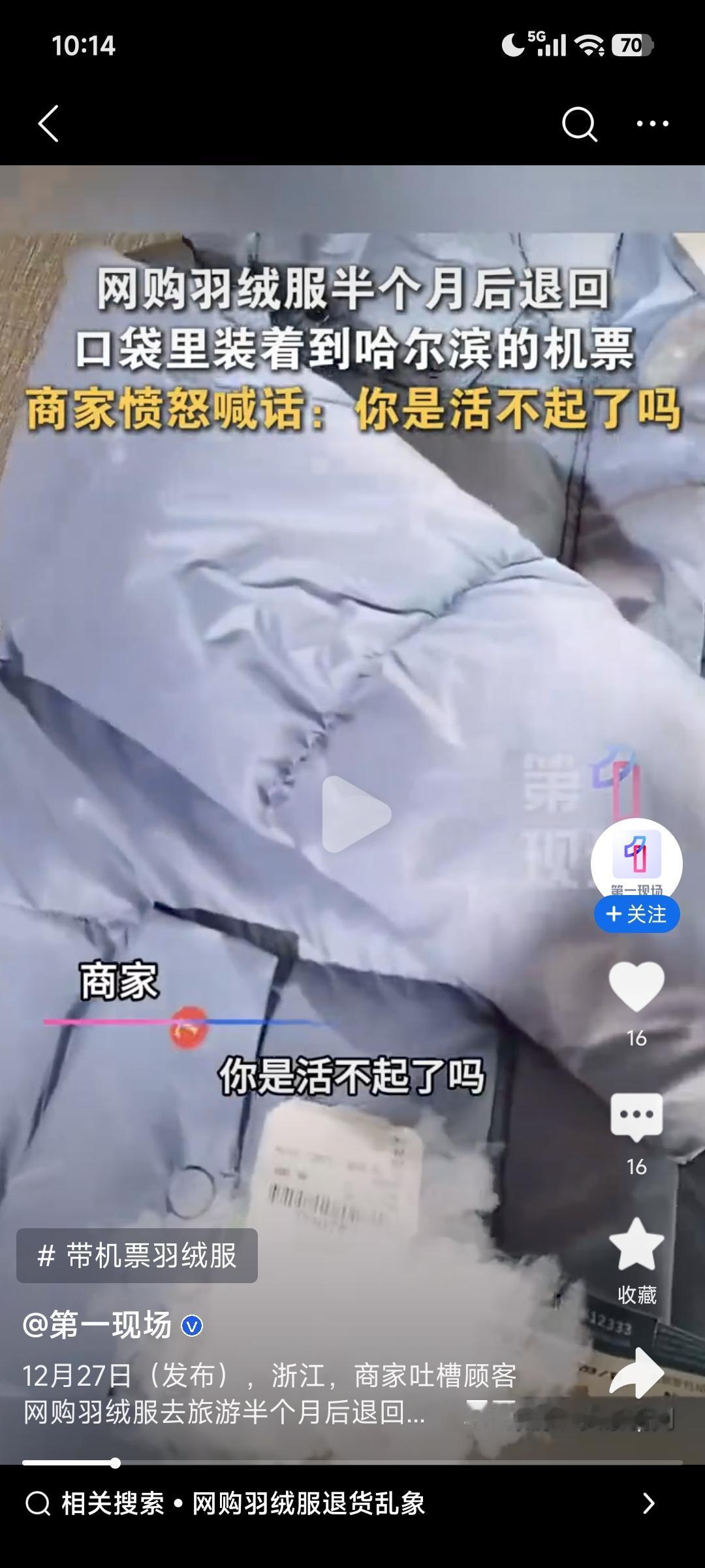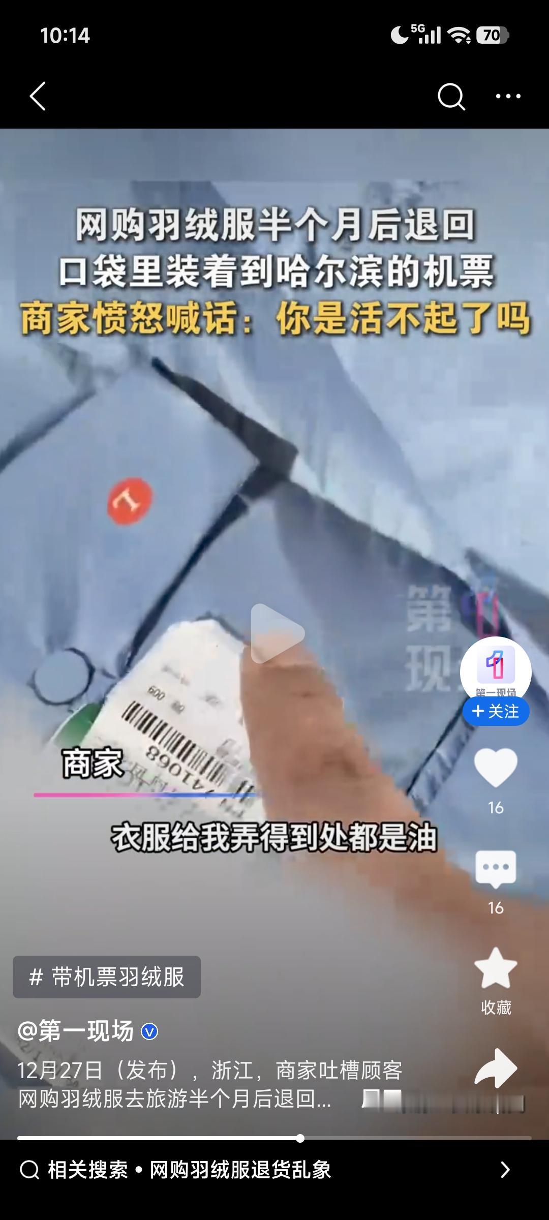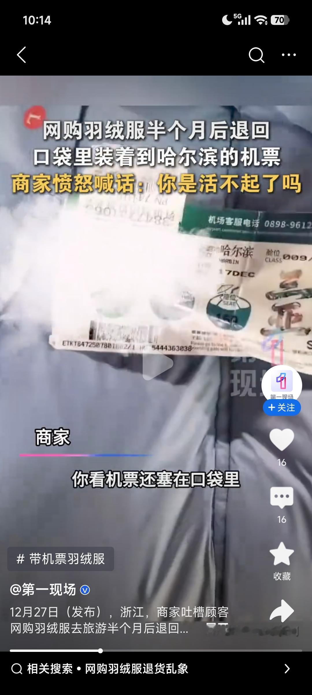 家人们,最近看到网购羽绒服半个月退回还口袋装机票这事,真的惊呆了。这买家也太心大了,羽绒服穿了半个月才退,还把机票留在口袋里。从商家角度想,这羽绒服可能被穿过、洗过,二次销售都成问题。而且机票留在里面,说不定是很重要的行程凭证。这也提醒我们,网购退换货时得做好检查,别给商家留麻烦,商家收到退货也该仔细查验,避免不必要的纠纷。大家网购退换货时有没有遇到过类似的奇葩事?