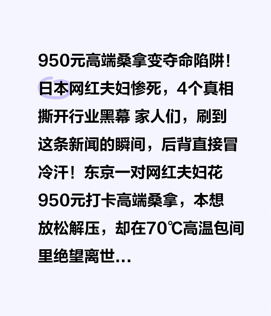 950元高端桑拿变夺命陷阱!日本网红夫妇惨死,4个真相撕开行业黑幕 家人们,刷到这条新闻的瞬间,后背直接冒冷汗!东京一对网红夫妇花950元打卡高端桑拿,本想放松解压,却在70℃高温包间里绝望离世,玻璃门上全是指甲抓挠的痕迹,3岁女儿永远等不到爸妈回家了😭 这对36岁的美发博主和37岁的美甲师妻子,是出了名的桑拿爱好者,经常在社交平台分享探店日常。12月15号,他们预订了号称“港区有钱人专属”的会员制桑拿店,谁能想到,这个宣传“私密奢华”的包间,竟是精心伪装的死亡牢笼。 起初大家都以为是高温中暑,但调查结果一出来,全网震怒!这根本不是意外,而是四重安全漏洞叠加的谋杀:门把手内外双双脱落,之前就有故障却只修不换,夫妻俩想开门逃生时,门闩完全卡死;标注“直通前台”的紧急按钮是彻头彻尾的摆设,压根没接电源,再怎么按压都没用;按规定该有3名工作人员值守,事发时店里空无一人,再用力拍打隔音玻璃也没人听见;更离谱的是,店家允许带手机进高温房,还存在桑拿石引燃毛巾的火源隐患。 最让人心碎的转折点来了——警方在现场发现,丈夫手上满是皮下出血,包间里的木制长凳被烧毁,推测两人被困后,曾用毛巾包裹高温桑拿石拼命砸门,想为自己开出一条生路。可70℃的高温早已超出人体耐受极限,热射病的病死率超50%,他们在缺氧、高温、绝望中,一点点耗尽了最后力气。 这事迅速引发日本全国自查,多家桑拿店被查出紧急按钮失效、门锁松动等问题。但更该警醒的是我们自己!冬天泡温泉、蒸桑拿成了刚需,可很多人不知道,热射病从不是夏季专属,密闭高温环境里,体温调节功能失衡只需几分钟,老人、小孩和慢性病患者风险翻倍 。 想想多后怕:你以为的放松休闲,可能藏着致命隐患;商家承诺的安全保障,或许只是忽悠人的噱头。这对夫妇的悲剧,给所有商家敲响警钟——安全不是摆设,而是底线;也给我们提了个醒:不管去什么场所,先查逃生通道和急救设备,饭后、酒后千万别立即蒸桑拿,独处时一定要告知亲友。 生命没有重来的机会,那些看似不起眼的安全细节,恰恰是守护我们的最后一道防线。希望这样的悲剧再也不要发生,也愿每个人都能在享受生活的同时,守住安全底线。同意的点赞转发,让更多人看到这份安全警示!
