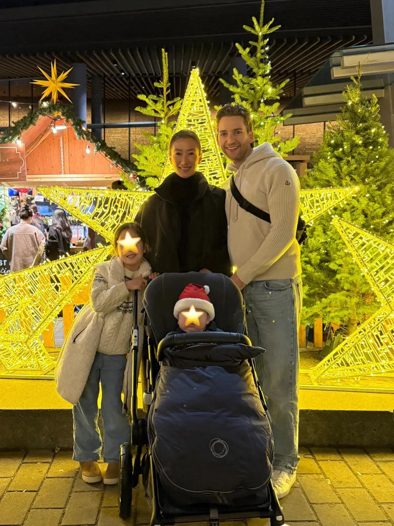 谢婷婷一家四口。谢婷婷有一女一儿,女儿是和前任生的,看长相是亚裔。小儿子长相是很典型的混血宝宝,是谢婷婷和现任男友生的。
