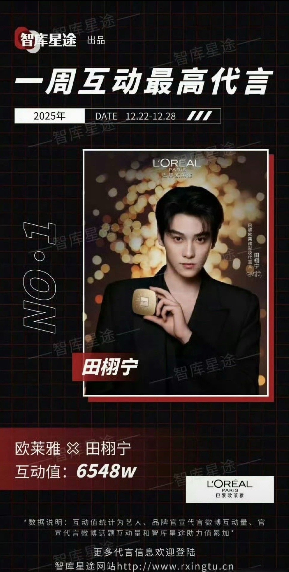田栩宁登顶一周互动最高代言,6500多万,好🔥啊!