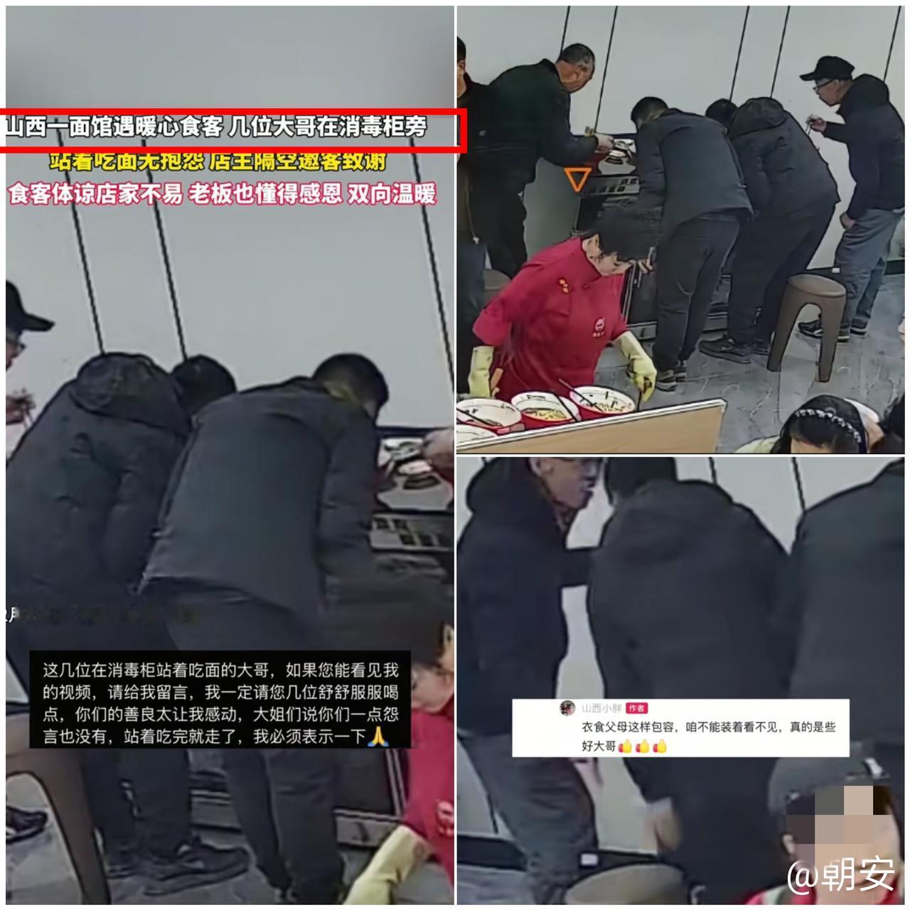 一碗面暖透全网! 山西面馆的双向温柔,才是成年人世界的治愈密码! 几位大哥挤在消毒柜旁站着吃面,没有抱怨没有催促,安安静静吃完就离场! 店主看在眼里记在心里,隔空喊话要请大哥们再来好好搓一顿。 这哪是简单的食客与店家,分明是陌生人之间最默契的互相体谅。 现在太多人总把“理所当然”挂在嘴边,嫌服务慢、怪环境差,却忘了彼此都有难处。 其实温暖从不需要惊天动地,食客多一份包容,店家多一份走心,就能化解所有隔阂。 成年人的世界从不是单方面的索取,而是你懂我的奔波不易,我念你的真诚付出。 这些藏在日常里的双向善意,才是驱散冷漠的光。 你在生活中遇到过这样互相体谅的温暖瞬间吗? 来评论区分享~